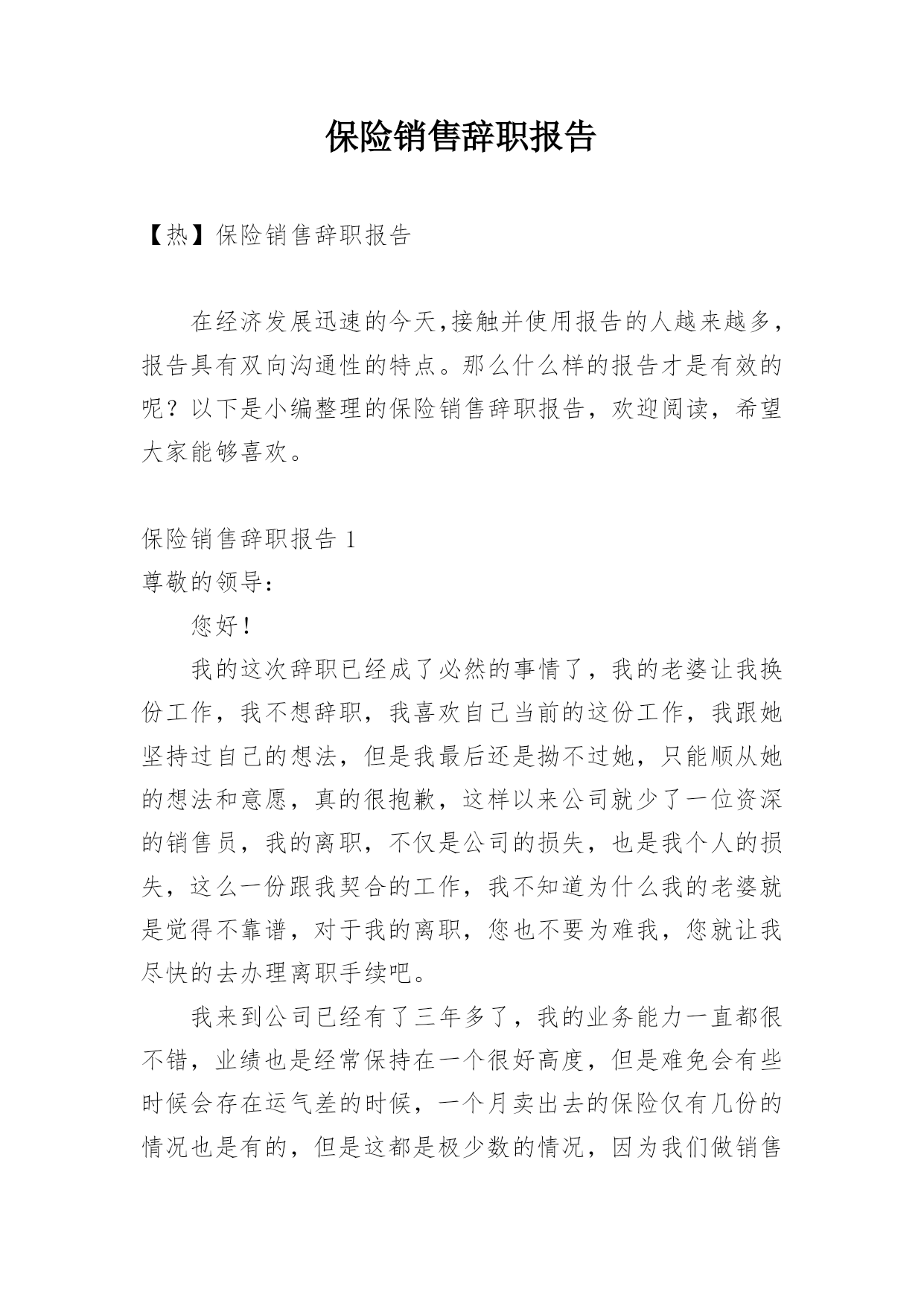保险销售辞职报告【热】保险销售辞职报告在经济发展迅速的今天,接触并使用报告的人越来越多,报告具有双向沟通性的特点。那么什么样的报告才是有效的呢?以下是小编整理的保险销售辞职报告,欢迎阅读,希望大家能够喜欢。保险销售辞职报告1尊敬的领导:您好!我的这次辞职已经成了必然的事情了,我的老婆让我换份工作,我不想辞职,我喜欢自己当前的这份工作,我跟她坚持过自己的想法,但是我最后还是拗不过她,只能顺从她的想法和意愿,真的很抱歉,这样以来公司就少了一位资深的销售员,我的离职,不仅是公司的损失,也是我个人的损失,这么一份