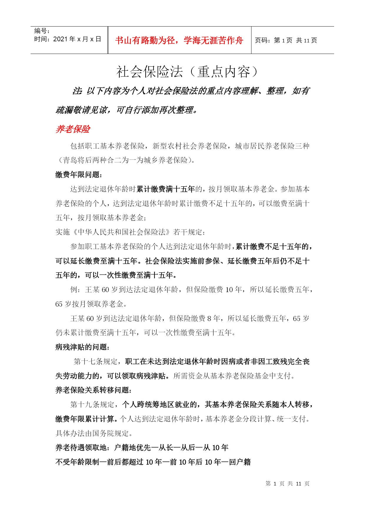 编号:时间:2021年x月x日书山有路勤为径,学海无涯苦作舟页码:第PAGE11页共NUMPAGES11页第PAGE\*MERGEFORMAT11页共NUMPAGES\*MERGEFORMAT11页社会保险法(重点内容)注:以下内容为个人对社会保险法的重点内容理解、整理,如有疏漏敬请见谅,可自行添加再次整理。养老保险包括职工基本养老保险,新型农村社会养老保险,城市居民养老保险三种(青岛将后两种合二为一为城乡养老保险)。缴费年限问题:达到法定退休年龄时累计缴费满十五年的,按月领取基本