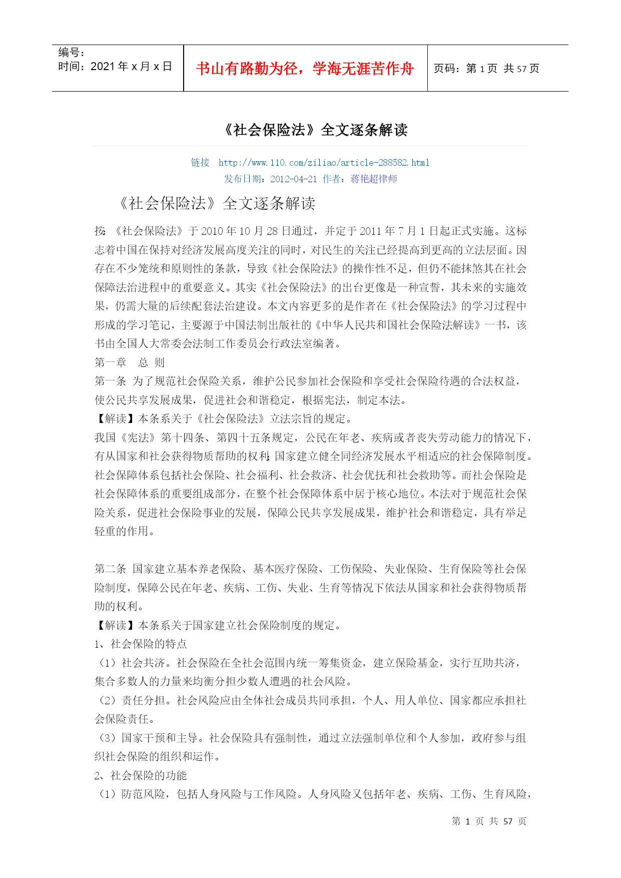 编号:时间:2021年x月x日书山有路勤为径,学海无涯苦作舟页码:第PAGE57页共NUMPAGES57页第PAGE\*MERGEFORMAT57页共NUMPAGES\*MERGEFORMAT57页《社会保险法》全文逐条解读链接http://www.110.com/ziliao/article-288582.html发布日期:2012-04-21作者:HYPERLINK"http://lawyer.110.com/1165435/"\t"_blank"蒋艳超律师《社会保险法》
