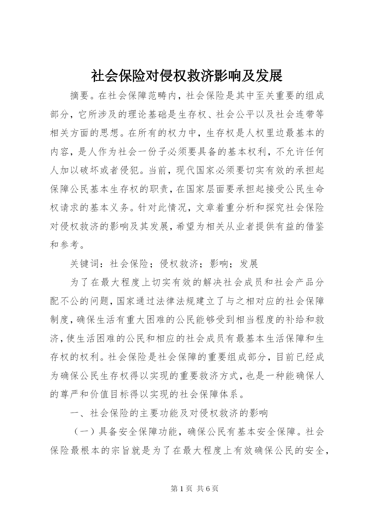 第PAGE\*Arabic\*MERGEFORMAT6页共NUMPAGES\*MERGEFORMAT6页社会保险对侵权救济影响及发展摘要。在社会保障范畴内,社会保险是其中至关重要的组成部分,它所涉及的理论基础是生存权、社会公平以及社会连带等相关方面的思想。在所有的权力中,生存权是人权里边最基本的内容,是人作为社会一份子必须要具备的基本权利,不允许任何人加以破坏或者侵犯。当前,现代国家必须要切实有效的承担起保障公民基本生存权的职责,在国家层面要承担起接受公民生命权请求的基本义务。针对此情况,文章