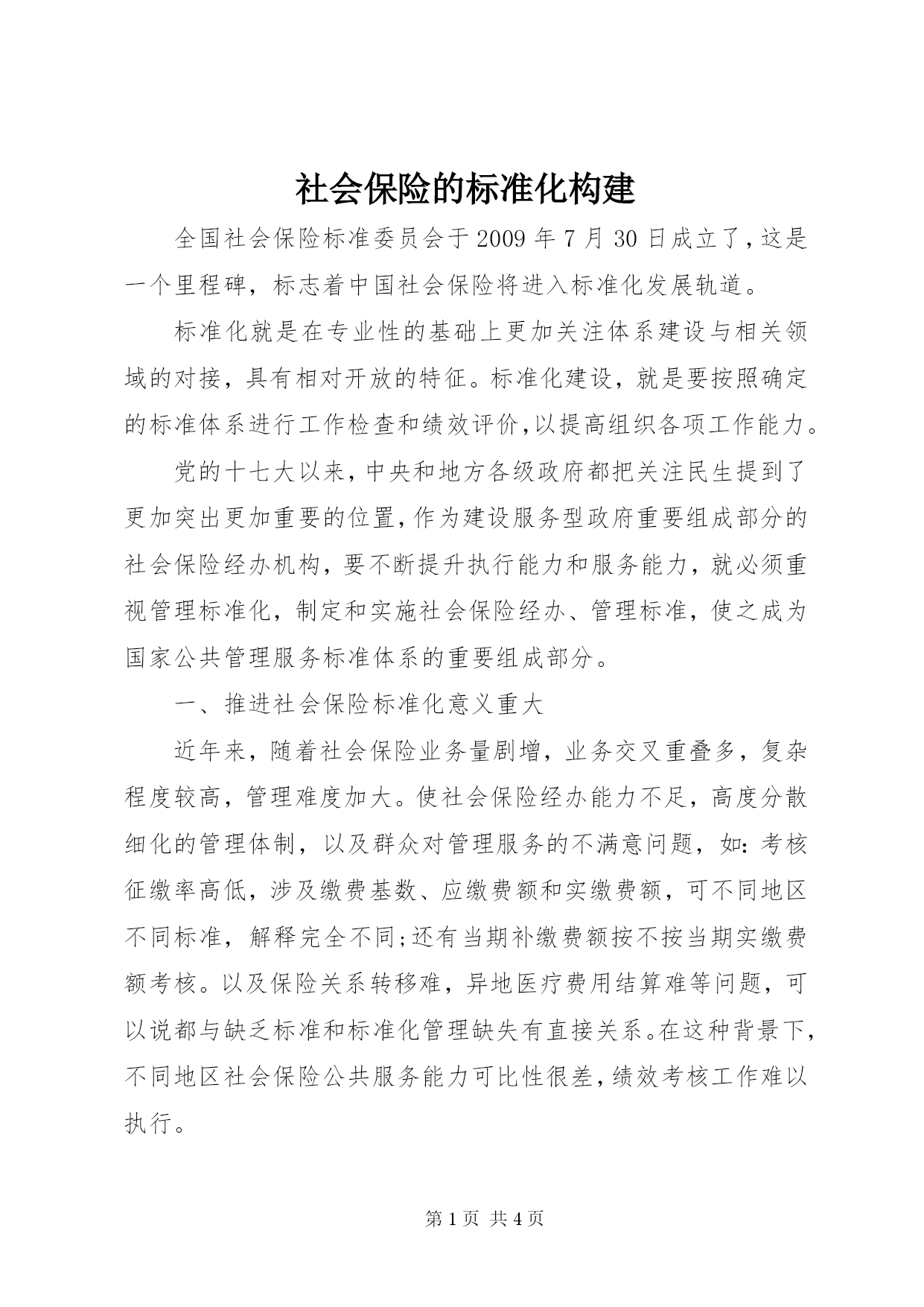 第PAGE\*Arabic\*MERGEFORMAT4页共NUMPAGES\*MERGEFORMAT4页社会保险的标准化构建全国社会保险标准委员会于2009年7月30日成立了,这是一个里程碑,标志着中国社会保险将进入标准化发展轨道。标准化就是在专业性的基础上更加关注体系建设与相关领域的对接,具有相对开放的特征。标准化建设,就是要按照确定的标准体系进行工作检查和绩效评价,以提高组织各项工作能力。党的十七大以来,中央和地方各级政府都把关注民生提到了更加突出更加重要的位置,作为建设服务型政府重要组成