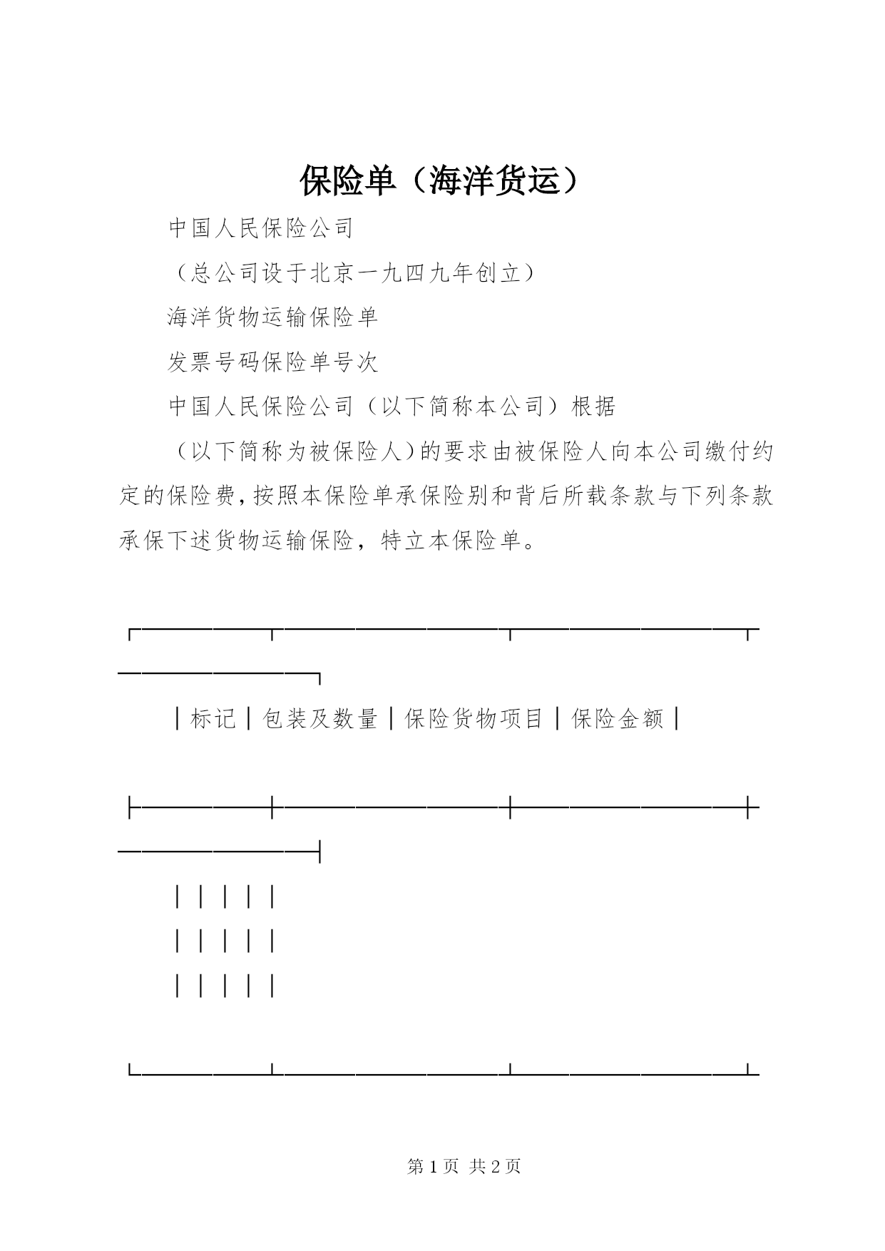 第PAGE\*Arabic\*MERGEFORMAT2页共NUMPAGES\*MERGEFORMAT2页保险单(海洋货运)中国人民保险公司(总公司设于北京一九四九年创立)海洋货物运输保险单发票号码保险单号次中国人民保险公司(以下简称本公司)根据(以下简称为被保险人)的要求由被保险人向本公司缴付约定的保险费,按照本保险单承保险别和背后所载条款与下列条款承保下述货物运输保险,特立本保险单。┌─────┬─────────┬─────────┬────────┐│标记│包装及数量│保险货物项目│保险