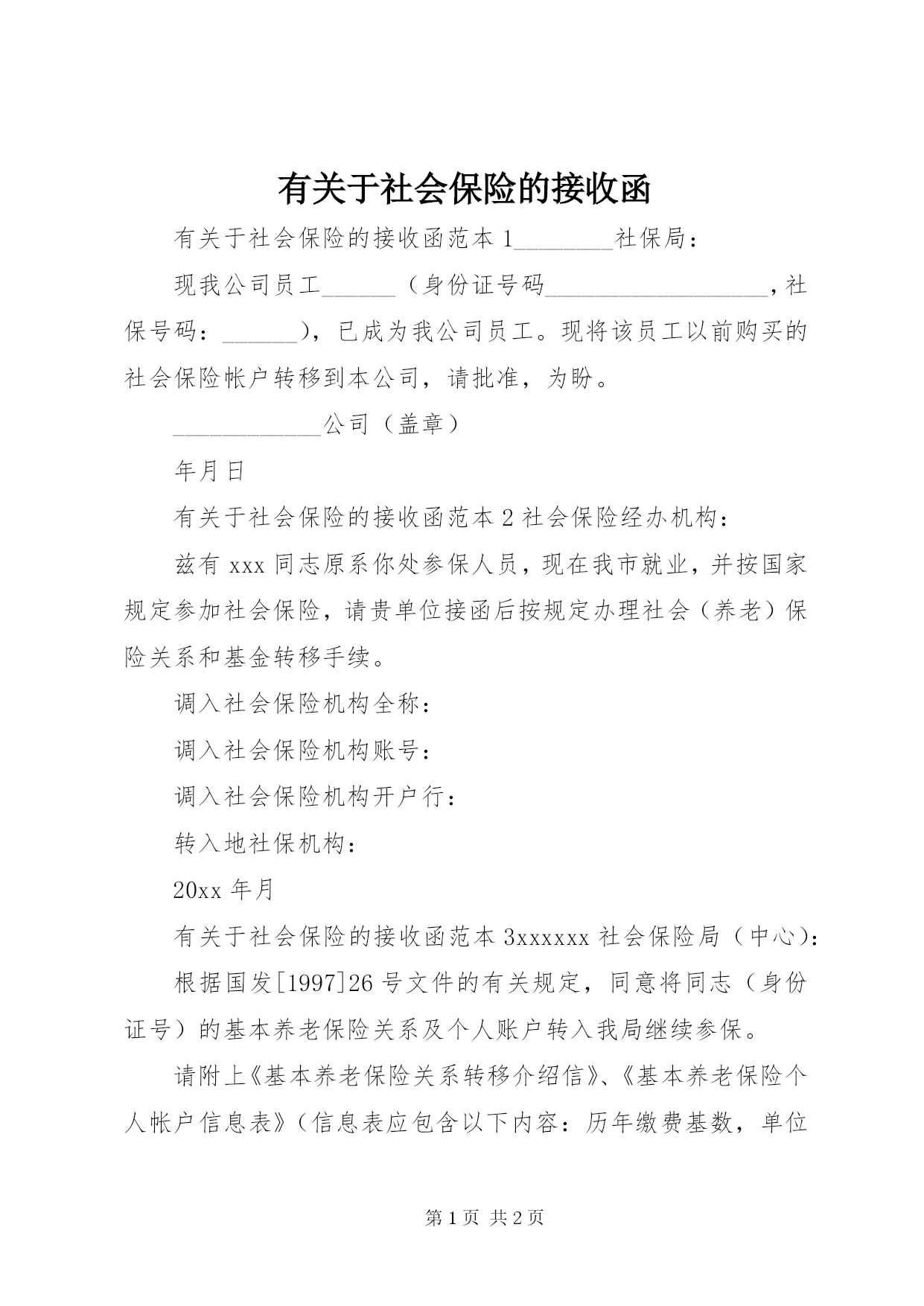 第PAGE\*Arabic\*MERGEFORMAT2页共NUMPAGES\*MERGEFORMAT2页有关于社会保险的接收函有关于社会保险的接收函范本1________社保局:现我公司员工______(身份证号码__________________,社保号码:______),已成为我公司员工。现将该员工以前购买的社会保险帐户转移到本公司,请批准,为盼。____________公司(盖章)年月日有关于社会保险的接收函范本2社会保险经办机构:兹有xxx同志原系你处参保人员,现在我市就业,并按国家