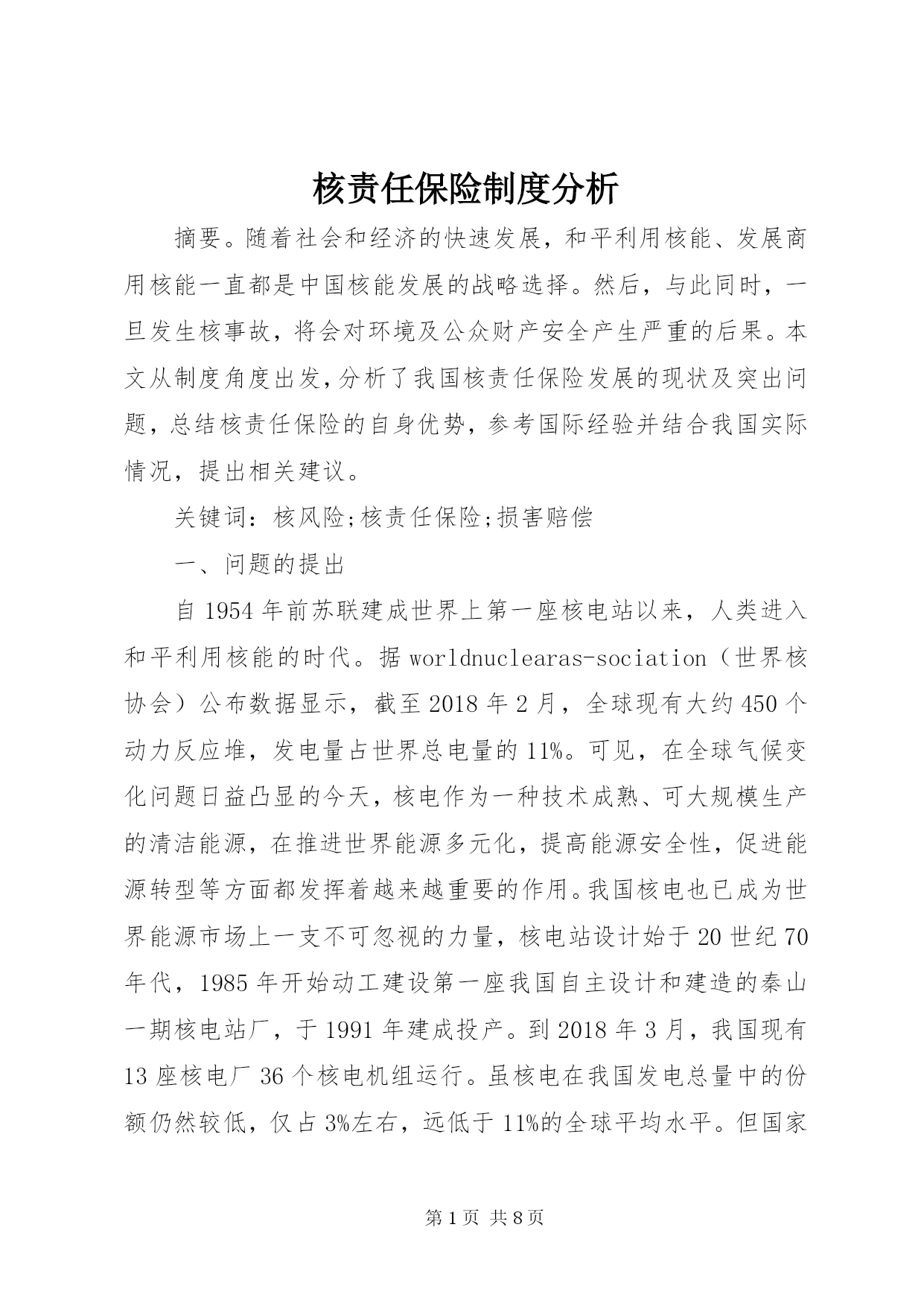 第PAGE\*Arabic\*MERGEFORMAT8页共NUMPAGES\*MERGEFORMAT8页核责任保险制度分析摘要。随着社会和经济的快速发展,和平利用核能、发展商用核能一直都是中国核能发展的战略选择。然后,与此同时,一旦发生核事故,将会对环境及公众财产安全产生严重的后果。本文从制度角度出发,分析了我国核责任保险发展的现状及突出问题,总结核责任保险的自身优势,参考国际经验并结合我国实际情况,提出相关建议。关键词:核风险;核责任保险;损害赔偿一、问题的提出自1954年前苏联建成世界上第
