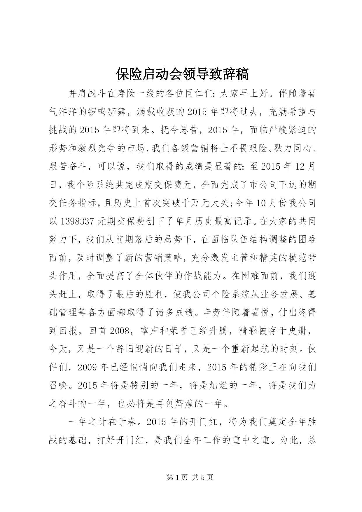 第PAGE\*Arabic\*MERGEFORMAT5页共NUMPAGES\*MERGEFORMAT5页保险启动会领导致辞稿并肩战斗在寿险一线的各位同仁们:大家早上好。伴随着喜气洋洋的锣鸣狮舞,满载收获的2015年即将过去,充满希望与挑战的2015年即将到来。抚今思昔,2015年,面临严峻紧迫的形势和激烈竞争的市场,我们各级营销将士不畏艰险、戮力同心、艰苦奋斗,可以说,我们取得的成绩是显著的:至2015年12月日,我个险系统共完成期交保费元,全面完成了市公司下达的期交任务指标,且历史上首次突破
