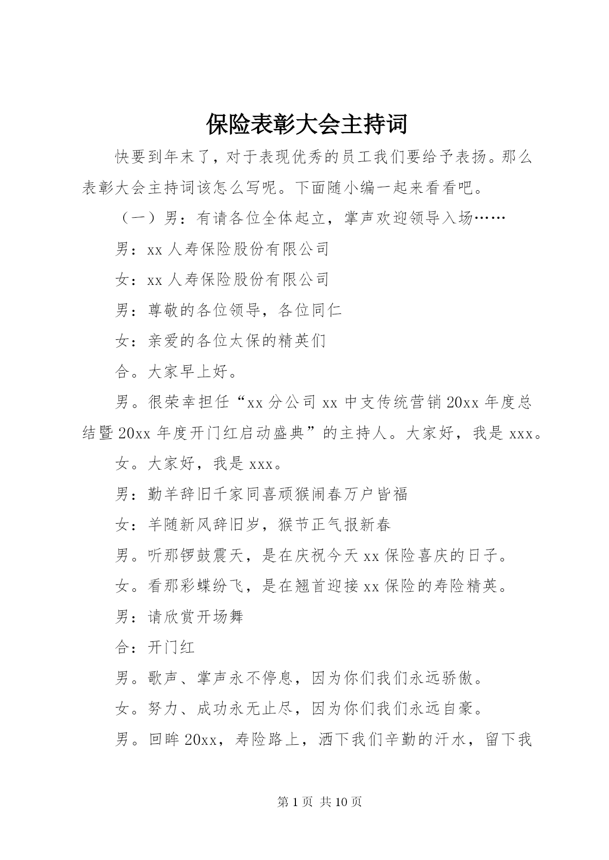 第PAGE\*Arabic\*MERGEFORMAT10页共NUMPAGES\*MERGEFORMAT10页保险表彰大会主持词快要到年末了,对于表现优秀的员工我们要给予表扬。那么表彰大会主持词该怎么写呢。下面随小编一起来看看吧。(一)男:有请各位全体起立,掌声欢迎领导入场……男:xx人寿保险股份有限公司女:xx人寿保险股份有限公司男:尊敬的各位领导,各位同仁女:亲爱的各位太保的精英们合。大家早上好。男。很荣幸担任“xx分公司xx中支传统营销20xx年度总结暨20xx年度开门红启动盛典”的主持人
