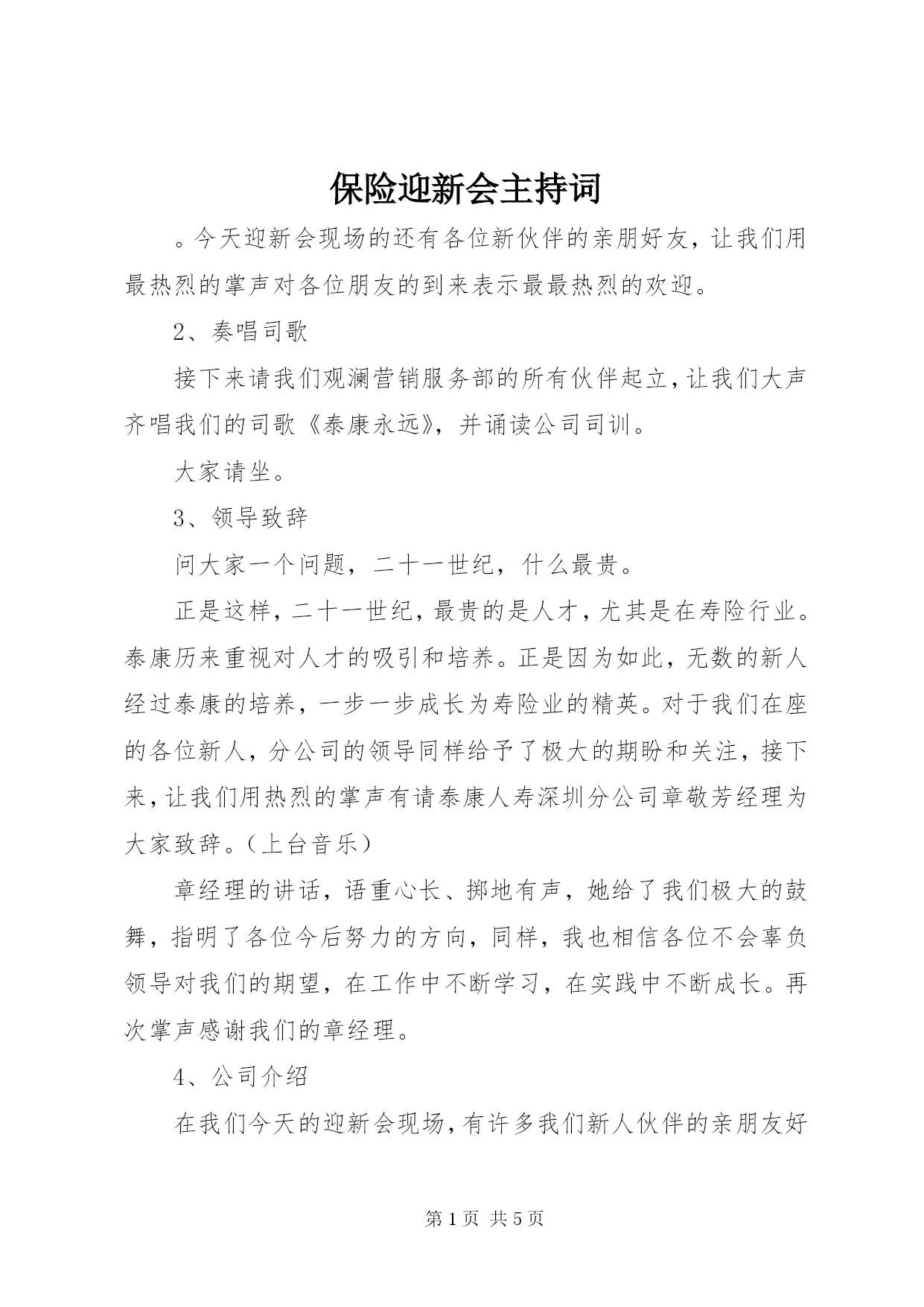 第PAGE\*Arabic\*MERGEFORMAT5页共NUMPAGES\*MERGEFORMAT5页保险迎新会主持词。今天迎新会现场的还有各位新伙伴的亲朋好友,让我们用最热烈的掌声对各位朋友的到来表示最最热烈的欢迎。2、奏唱司歌接下来请我们观澜营销服务部的所有伙伴起立,让我们大声齐唱我们的司歌《泰康永远》,并诵读公司司训。大家请坐。3、领导致辞问大家一个问题,二十一世纪,什么最贵。正是这样,二十一世纪,最贵的是人才,尤其是在寿险行业。泰康历来重视对人才的吸引和培养。正是因为如此,无数的新人