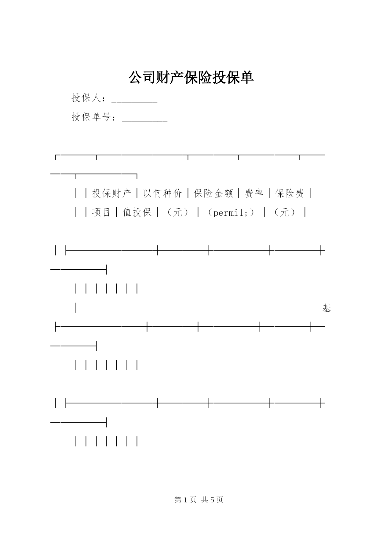 第PAGE\*Arabic\*MERGEFORMAT5页共NUMPAGES\*MERGEFORMAT5页公司财产保险投保单投保人:_________投保单号:_________┌───┬────────┬────┬─────┬────┬─────┐││投保财产│以何种价│保险金额│费率│保险费│││项目│值投保│(元)│(permil;)│(元)││├────────┼────┼─────┼────┼─────┤││││││││基├────────┼────┼─────┼────┼─────┤
