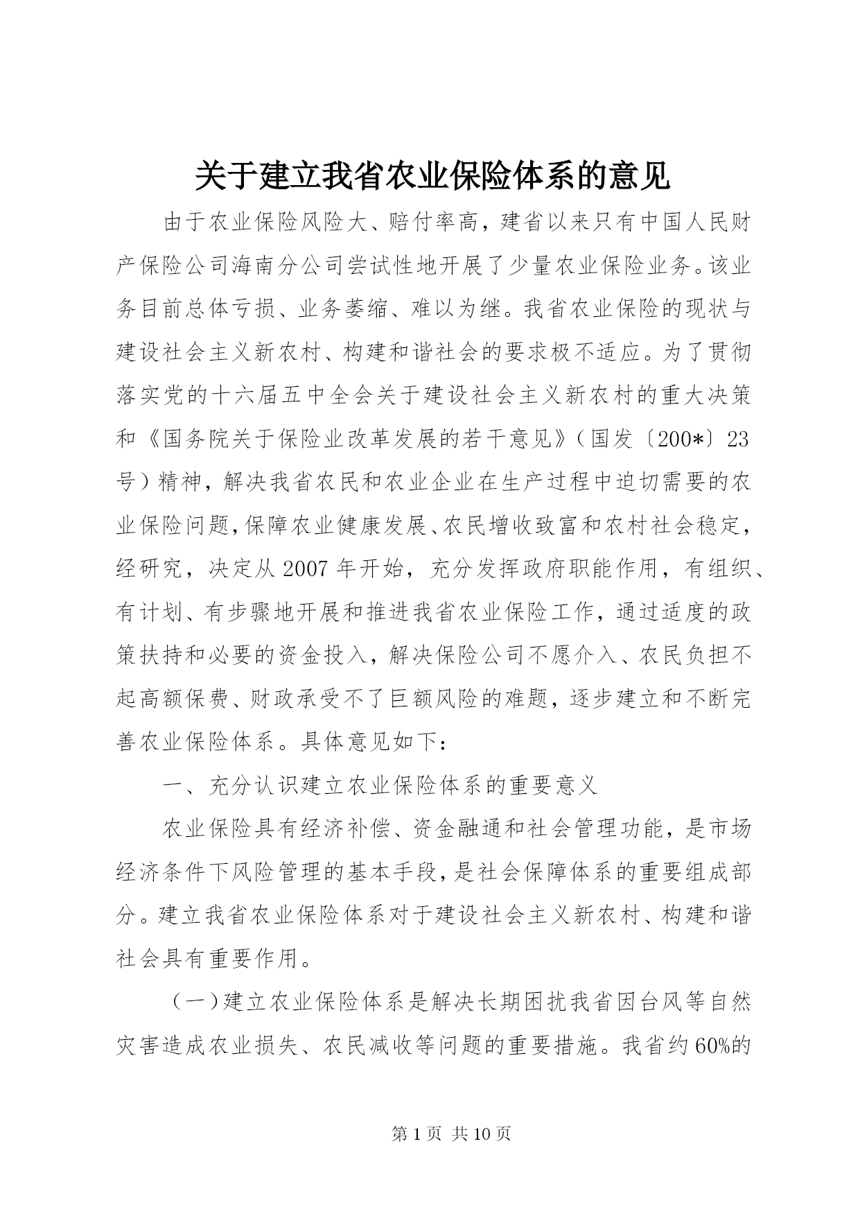 第PAGE\*Arabic\*MERGEFORMAT10页共NUMPAGES\*MERGEFORMAT10页关于建立我省农业保险体系的意见由于农业保险风险大、赔付率高,建省以来只有中国人民财产保险公司海南分公司尝试性地开展了少量农业保险业务。该业务目前总体亏损、业务萎缩、难以为继。我省农业保险的现状与建设社会主义新农村、构建和谐社会的要求极不适应。为了贯彻落实党的十六届五中全会关于建设社会主义新农村的重大决策和《国务院关于保险业改革发展的若干意见》(国发〔200*〕23号)精神,解决我省农民和