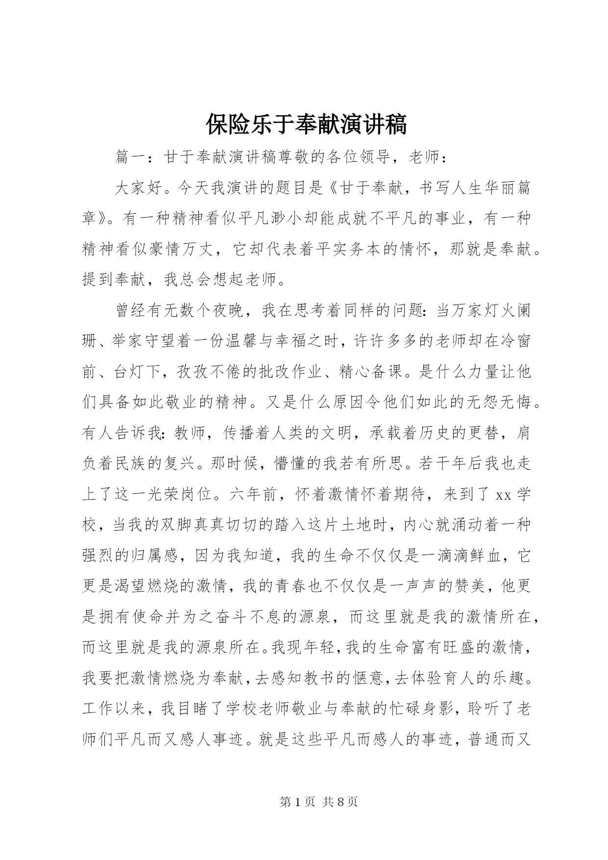 第PAGE\*Arabic\*MERGEFORMAT8页共NUMPAGES\*MERGEFORMAT8页保险乐于奉献演讲稿篇一:甘于奉献演讲稿尊敬的各位领导,老师:大家好。今天我演讲的题目是《甘于奉献,书写人生华丽篇章》。有一种精神看似平凡渺小却能成就不平凡的事业,有一种精神看似豪情万丈,它却代表着平实务本的情怀,那就是奉献。提到奉献,我总会想起老师。曾经有无数个夜晚,我在思考着同样的问题:当万家灯火阑珊、举家守望着一份温馨与幸福之时,许许多多的老师却在冷窗前、台灯下,孜孜不倦的批改作业、精心