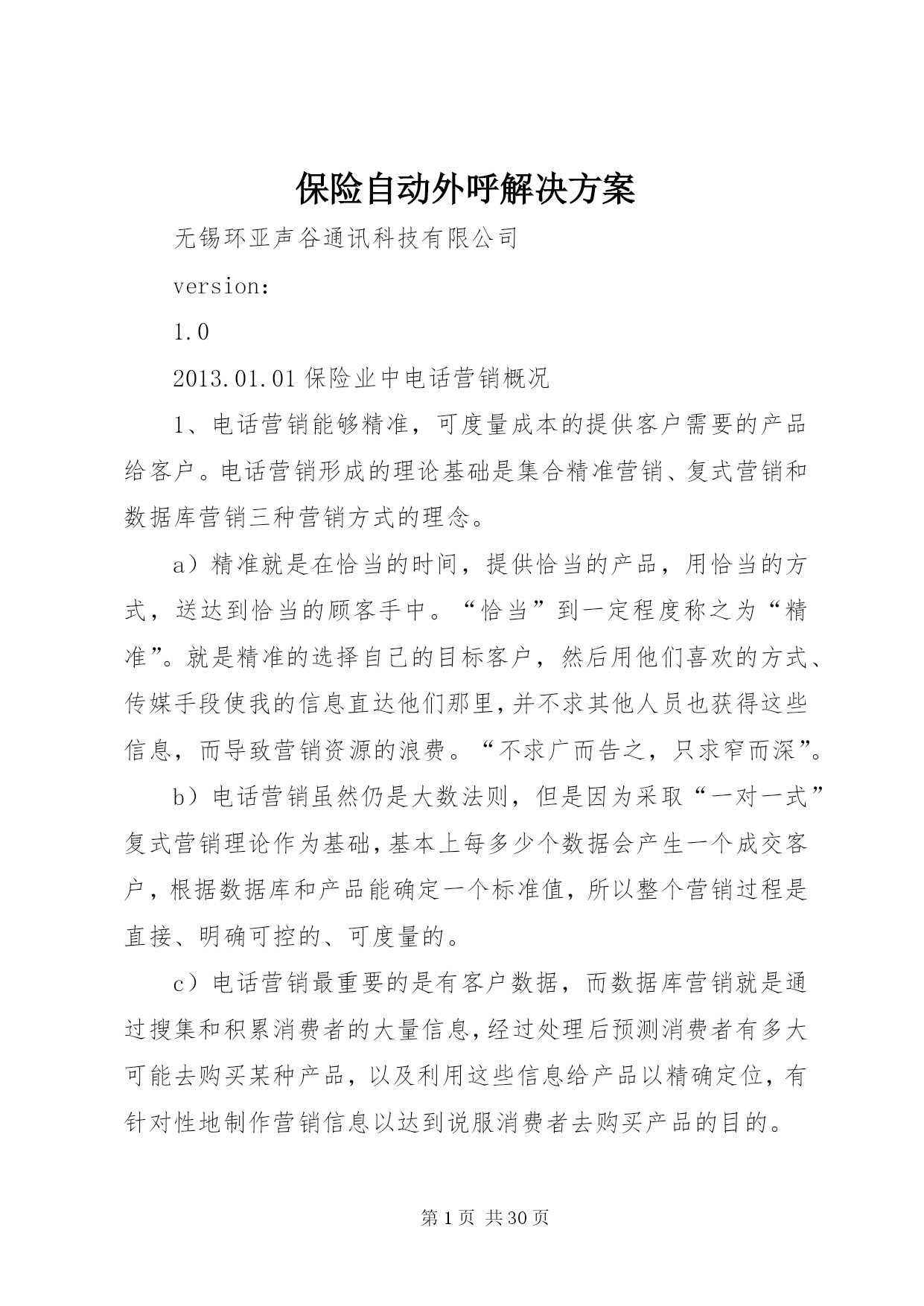 第PAGE\*Arabic\*MERGEFORMAT30页共NUMPAGES\*MERGEFORMAT30页保险自动外呼解决方案无锡环亚声谷通讯科技有限公司version:1.02013.01.01保险业中电话营销概况1、电话营销能够精准,可度量成本的提供客户需要的产品给客户。电话营销形成的理论基础是集合精准营销、复式营销和数据库营销三种营销方式的理念。a)精准就是在恰当的时间,提供恰当的产品,用恰当的方式,送达到恰当的顾客手中。“恰当”到一定程度称之为“精准”。就是精准的选择自己的目标客户,