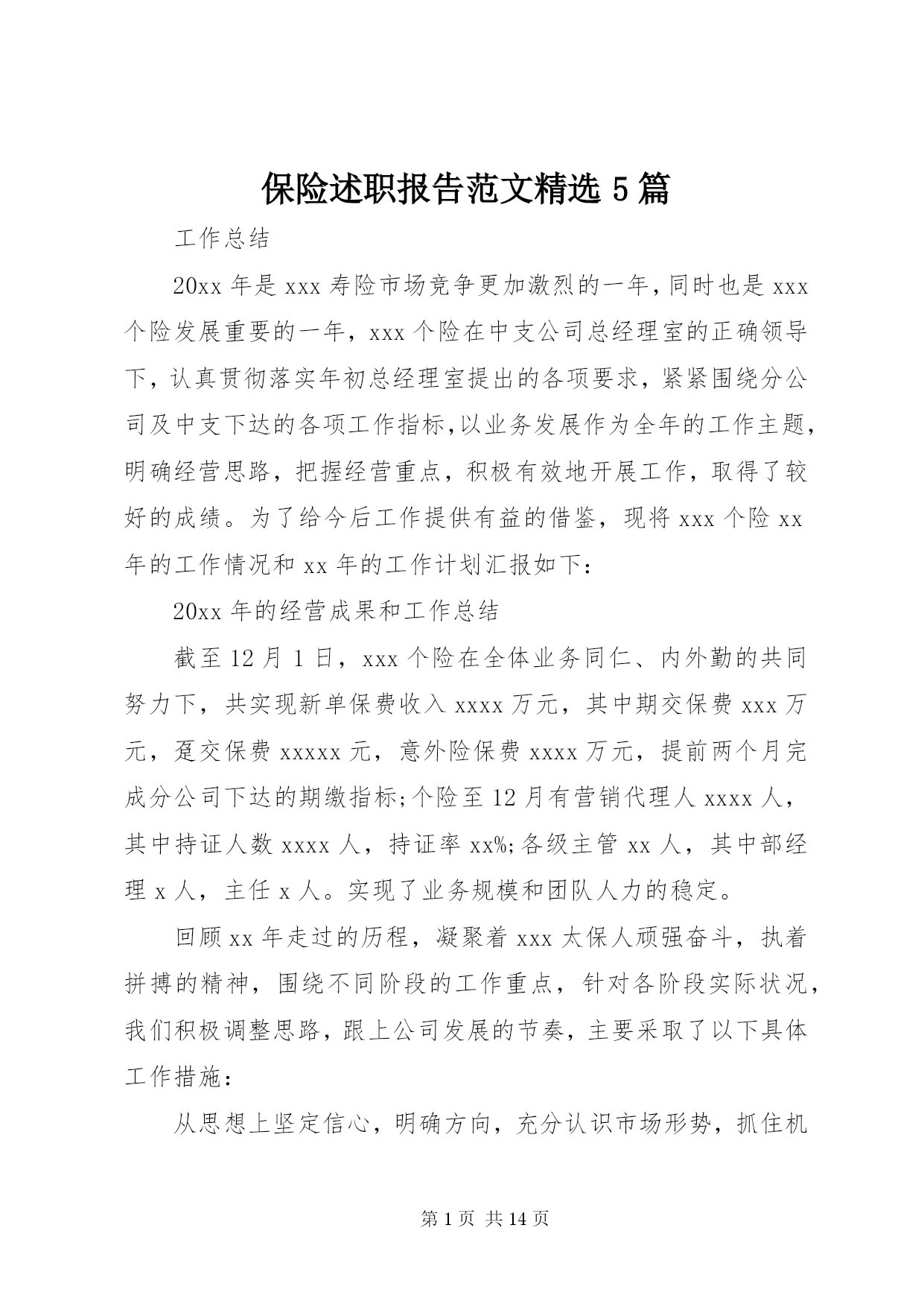 第PAGE\*Arabic\*MERGEFORMAT14页共NUMPAGES\*MERGEFORMAT14页保险述职报告范文精选5篇工作总结20xx年是xxx寿险市场竞争更加激烈的一年,同时也是xxx个险发展重要的一年,xxx个险在中支公司总经理室的正确领导下,认真贯彻落实年初总经理室提出的各项要求,紧紧围绕分公司及中支下达的各项工作指标,以业务发展作为全年的工作主题,明确经营思路,把握经营重点,积极有效地开展工作,取得了较好的成绩。为了给今后工作提供有益的借鉴,现将xxx个险xx年的工作情况