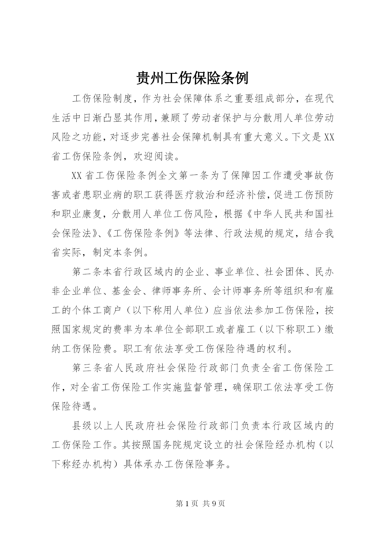第PAGE\*Arabic\*MERGEFORMAT9页共NUMPAGES\*MERGEFORMAT9页贵州工伤保险条例工伤保险制度,作为社会保障体系之重要组成部分,在现代生活中日渐凸显其作用,兼顾了劳动者保护与分散用人单位劳动风险之功能,对逐步完善社会保障机制具有重大意义。下文是XX省工伤保险条例,欢迎阅读。XX省工伤保险条例全文第一条为了保障因工作遭受事故伤害或者患职业病的职工获得医疗救治和经济补偿,促进工伤预防和职业康复,分散用人单位工伤风险,根据《中华人民共和国社会保险法》、《工伤保险