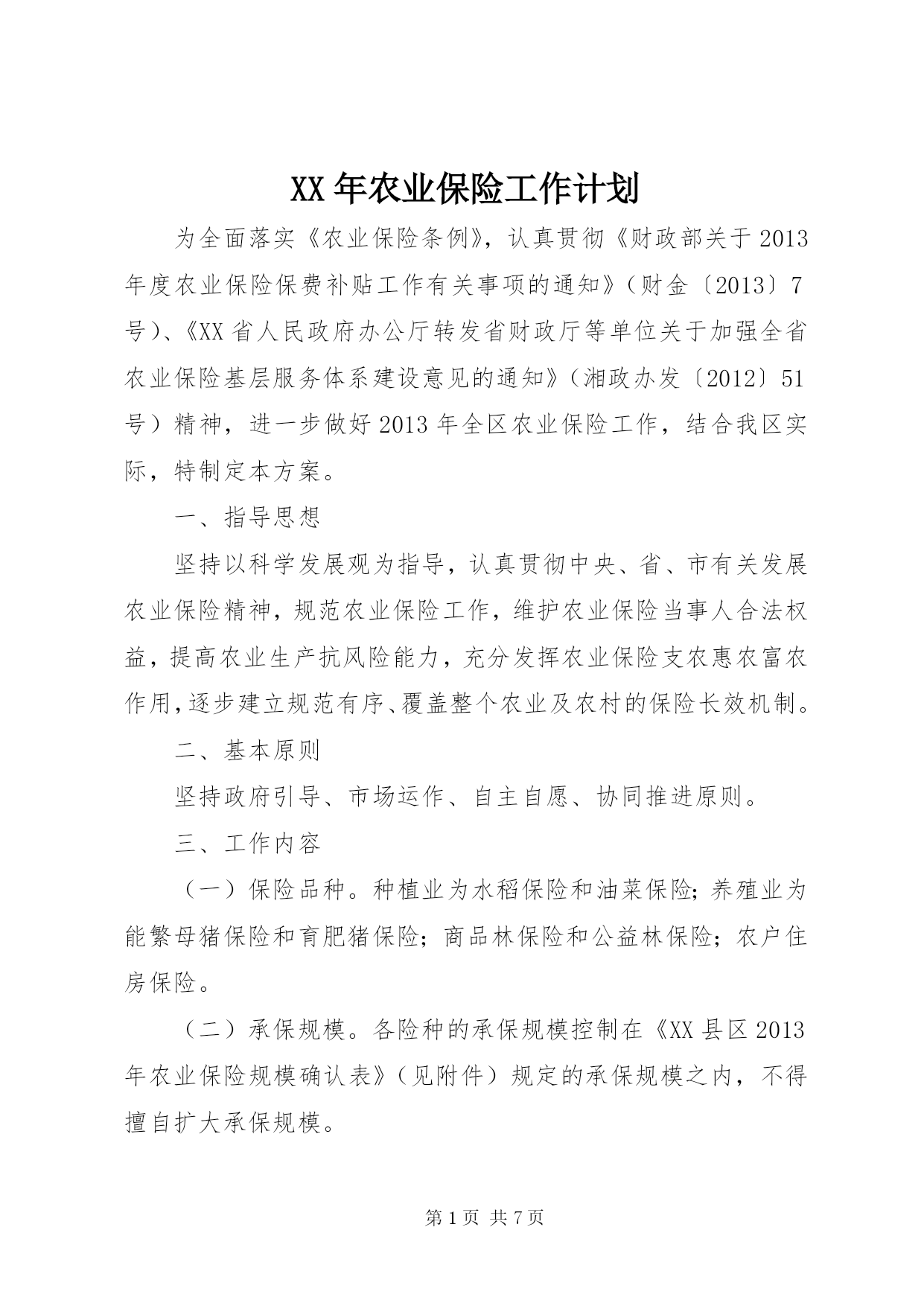 第PAGE\*Arabic\*MERGEFORMAT7页共NUMPAGES\*MERGEFORMAT7页XX年农业保险工作计划为全面落实《农业保险条例》,认真贯彻《财政部关于2013年度农业保险保费补贴工作有关事项的通知》(财金〔2013〕7号)、《XX省人民政府办公厅转发省财政厅等单位关于加强全省农业保险基层服务体系建设意见的通知》(湘政办发〔2012〕51号)精神,进一步做好2013年全区农业保险工作,结合我区实际,特制定本方案。一、指导思想坚持以科学发展观为指导,认真贯彻中央、省、市有关