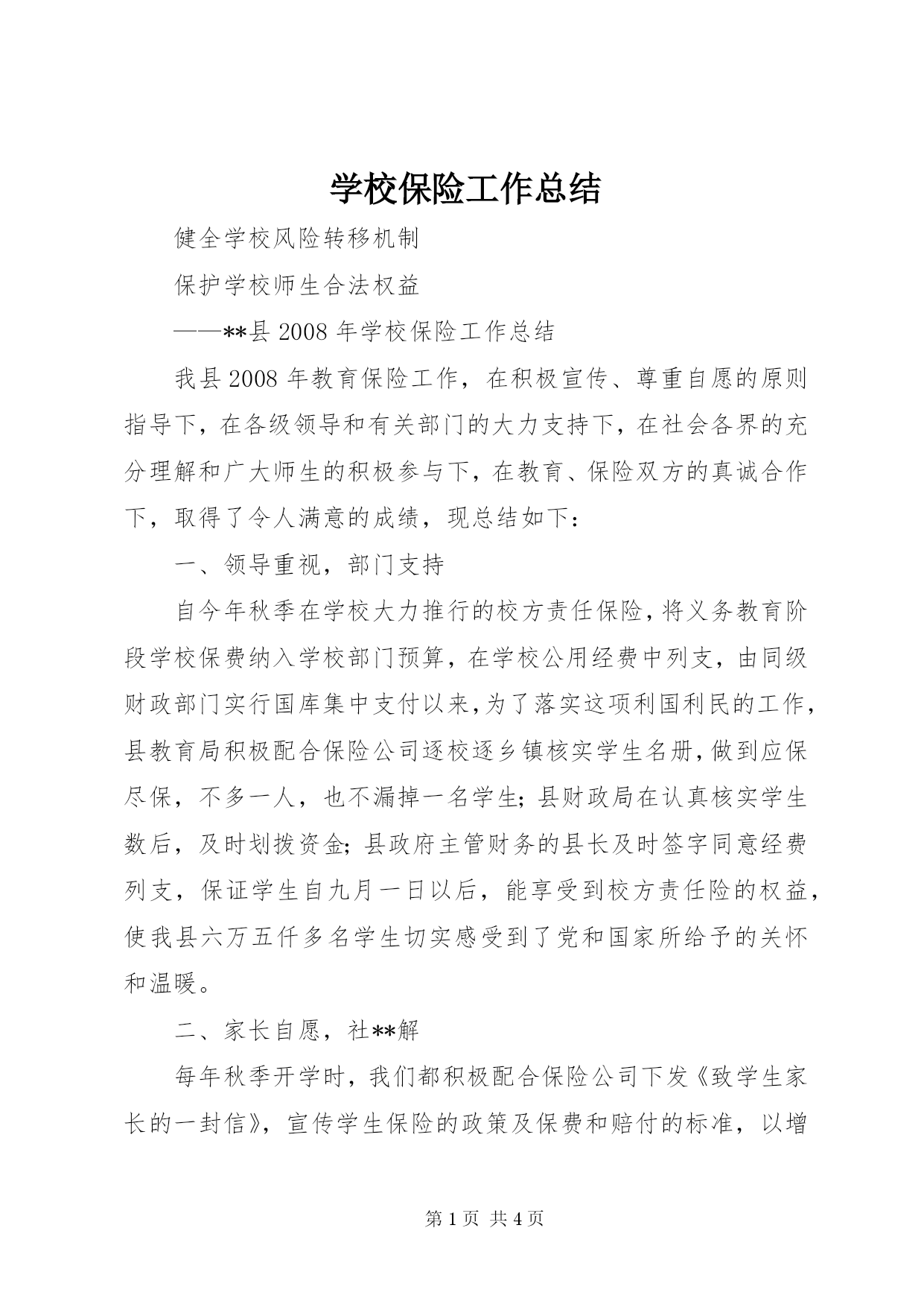 第PAGE\*Arabic\*MERGEFORMAT4页共NUMPAGES\*MERGEFORMAT4页学校保险工作总结健全学校风险转移机制保护学校师生合法权益——**县2008年学校保险工作总结我县2008年教育保险工作,在积极宣传、尊重自愿的原则指导下,在各级领导和有关部门的大力支持下,在社会各界的充分理解和广大师生的积极参与下,在教育、保险双方的真诚合作下,取得了令人满意的成绩,现总结如下:一、领导重视,部门支持自今年秋季在学校大力推行的校方责任保险,将义务教育阶段学校保费纳入学校部门预