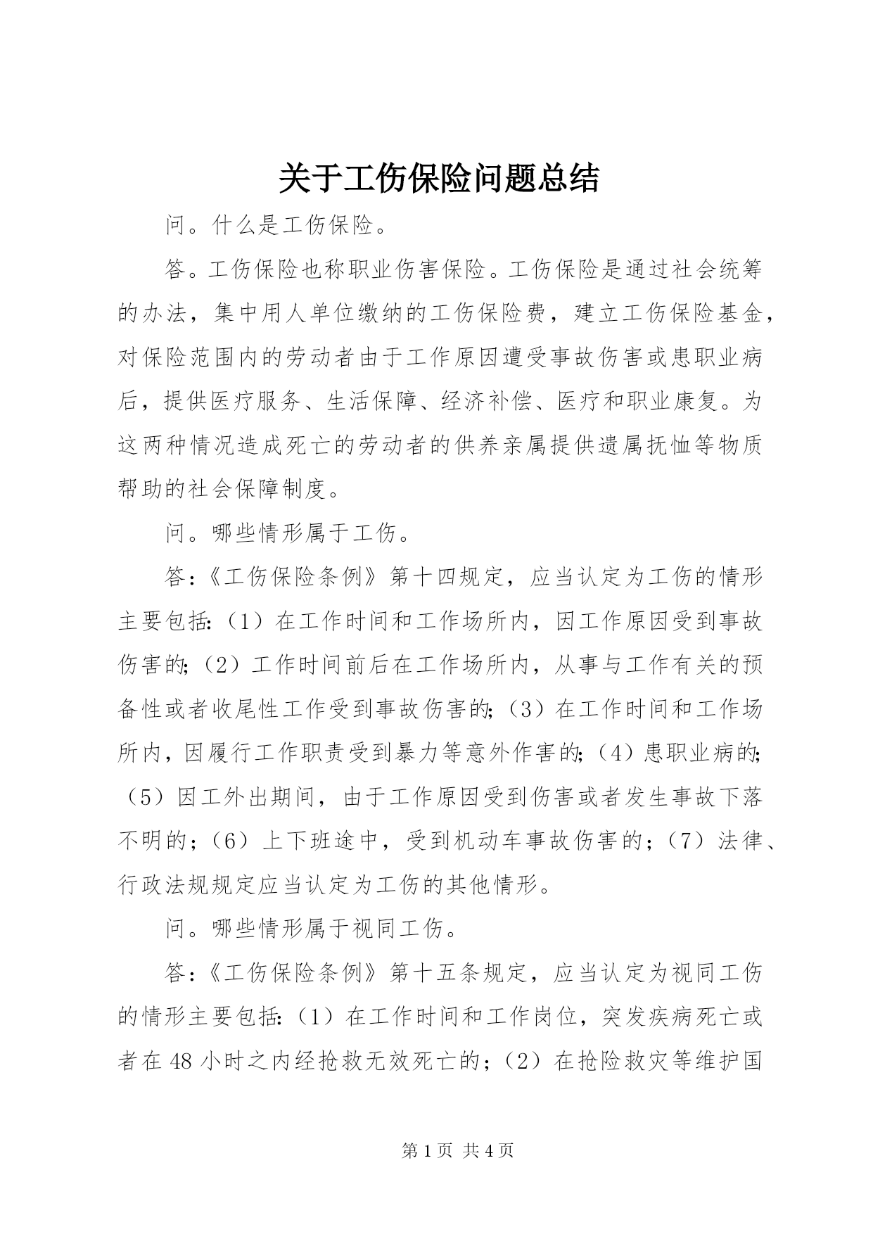 第PAGE\*Arabic\*MERGEFORMAT4页共NUMPAGES\*MERGEFORMAT4页关于工伤保险问题总结问。什么是工伤保险。答。工伤保险也称职业伤害保险。工伤保险是通过社会统筹的办法,集中用人单位缴纳的工伤保险费,建立工伤保险基金,对保险范围内的劳动者由于工作原因遭受事故伤害或患职业病后,提供医疗服务、生活保障、经济补偿、医疗和职业康复。为这两种情况造成死亡的劳动者的供养亲属提供遗属抚恤等物质帮助的社会保障制度。问。哪些情形属于工伤。答:《工伤保险条例》第十四规定,应当认定