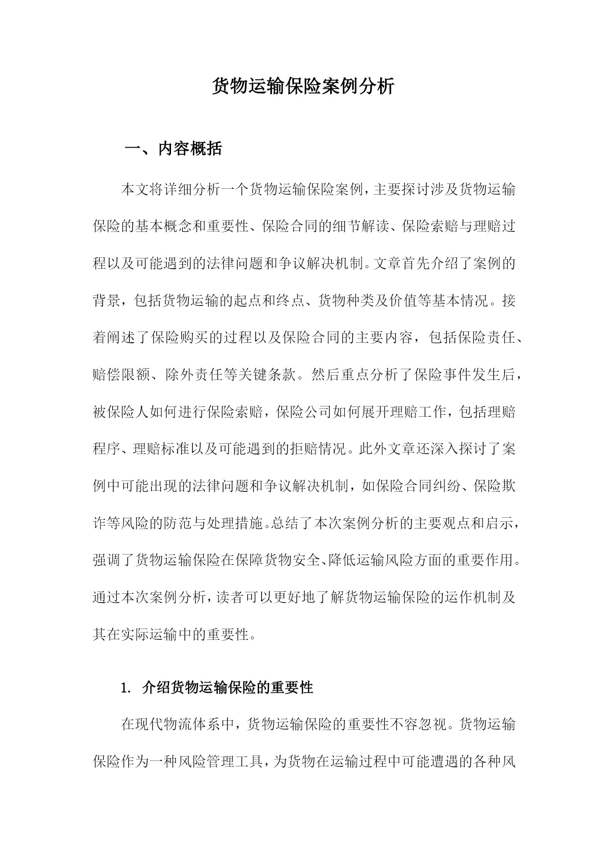 货物运输保险案例分析一、内容概括本文将详细分析一个货物运输保险案例,主要探讨涉及货物运输保险的基本概念和重要性、保险合同的细节解读、保险索赔与理赔过程以及可能遇到的法律问题和争议解决机制。文章首先介绍了案例的背景,包括货物运输的起点和终点、货物种类及价值等基本情况。接着阐述了保险购买的过程以及保险合同的主要内容,包括保险责任、赔偿限额、除外责任等关键条款。然后重点分析了保险事件发生后,被保险人如何进行保险索赔,保险公司如何展开理赔工作,包括理赔程序、理赔标准以及可能遇到的拒赔情况。此外文章还深入探讨了案例