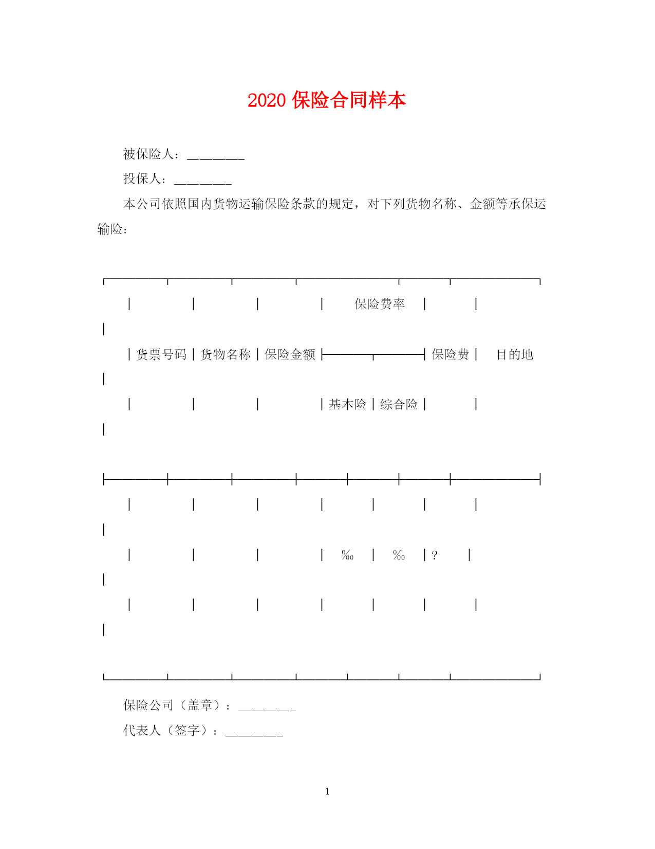 此资料由网络收集而来,如有侵权请告知上传者立即删除。资料共分享,我们负责传递知识。PAGEPAGE22020保险合同样本被保险人:_________投保人:_________本公司依照国内货物运输保险条款的规定,对下列货物名称、金额等承保运输险:┌────┬────┬────┬───────┬───┬──────┐││││保险费率││││货票号码│货物名称│保险金额├───┬───┤保险费│目的地│││││基本险│综合险│││├────┼────┼────┼───┼───┼───┼──────
