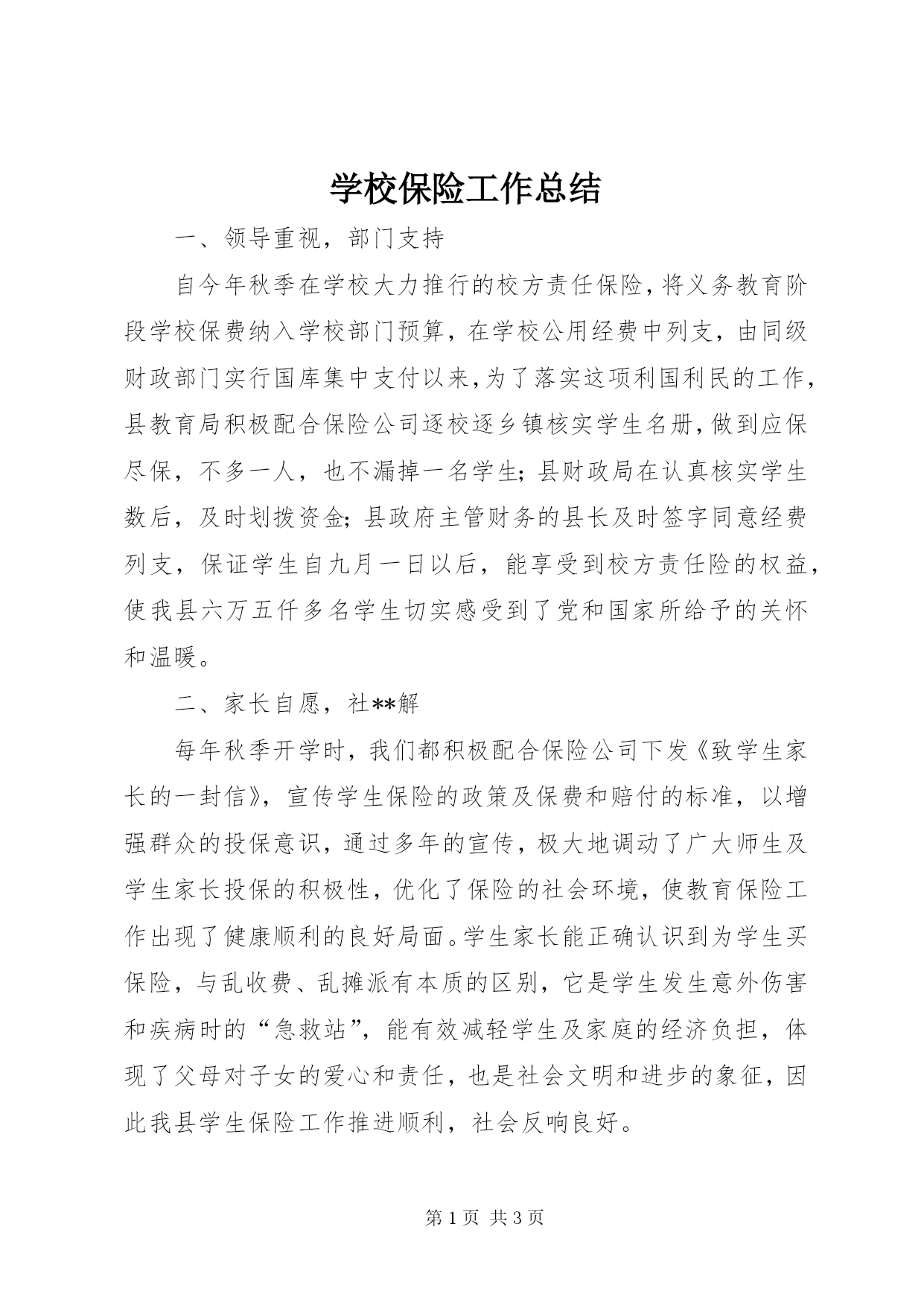 第PAGE\*Arabic\*MERGEFORMAT3页共NUMPAGES\*MERGEFORMAT3页学校保险工作总结一、领导重视,部门支持自今年秋季在学校大力推行的校方责任保险,将义务教育阶段学校保费纳入学校部门预算,在学校公用经费中列支,由同级财政部门实行国库集中支付以来,为了落实这项利国利民的工作,县教育局积极配合保险公司逐校逐乡镇核实学生名册,做到应保尽保,不多一人,也不漏掉一名学生;县财政局在认真核实学生数后,及时划拨资金;县政府主管财务的县长及时签字同意经费列支,保证学生自九月一