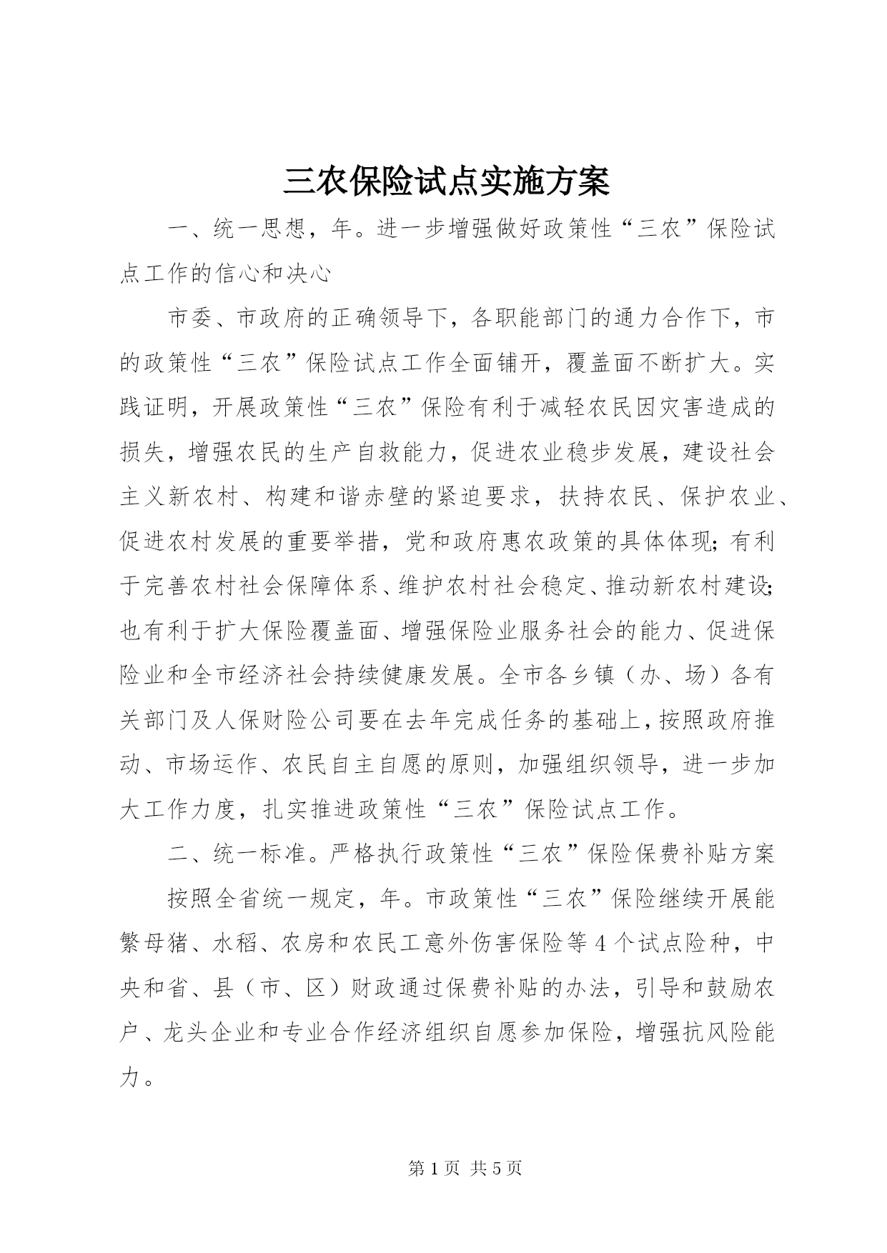 第PAGE\*Arabic\*MERGEFORMAT5页共NUMPAGES\*MERGEFORMAT5页三农保险试点实施方案一、统一思想,年。进一步增强做好政策性“三农”保险试点工作的信心和决心市委、市政府的正确领导下,各职能部门的通力合作下,市的政策性“三农”保险试点工作全面铺开,覆盖面不断扩大。实践证明,开展政策性“三农”保险有利于减轻农民因灾害造成的损失,增强农民的生产自救能力,促进农业稳步发展,建设社会主义新农村、构建和谐赤壁的紧迫要求,扶持农民、保护农业、促进农村发展的重要举措,党和