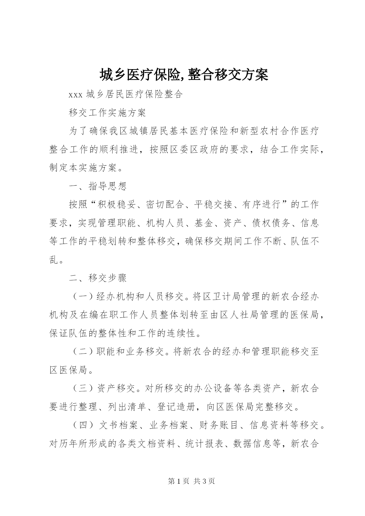 第PAGE\*Arabic\*MERGEFORMAT3页共NUMPAGES\*MERGEFORMAT3页城乡医疗保险,整合移交方案xxx城乡居民医疗保险整合移交工作实施方案为了确保我区城镇居民基本医疗保险和新型农村合作医疗整合工作的顺利推进,按照区委区政府的要求,结合工作实际,制定本实施方案。一、指导思想按照“积极稳妥、密切配合、平稳交接、有序进行”的工作要求,实现管理职能、机构人员、基金、资产、债权债务、信息等工作的平稳划转和整体移交,确保移交期间工作不断、队伍不乱。二、移交步骤(一)经办机