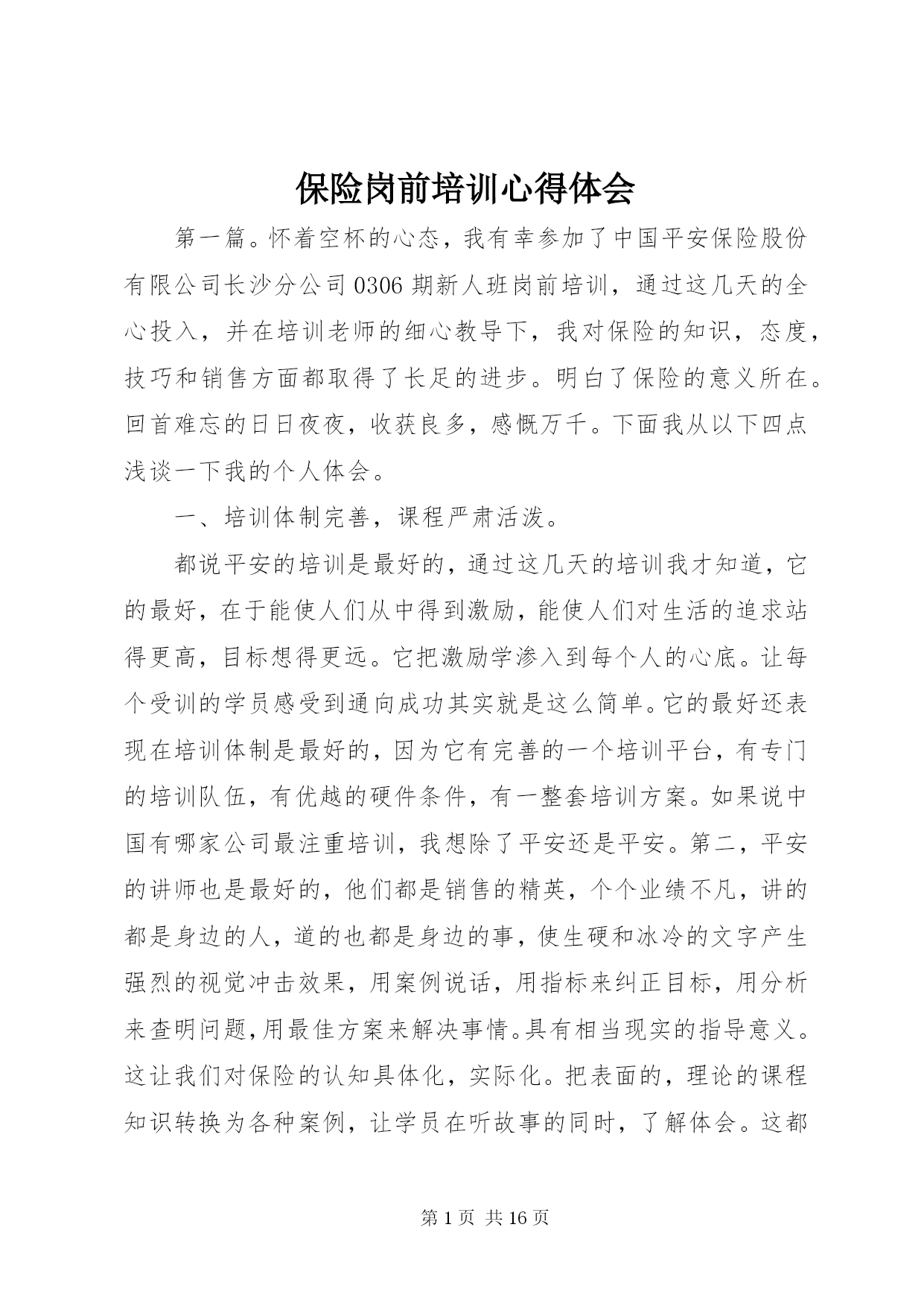 第PAGE\*Arabic\*MERGEFORMAT16页共NUMPAGES\*MERGEFORMAT16页保险岗前培训心得体会第一篇。怀着空杯的心态,我有幸参加了中国平安保险股份有限公司长沙分公司0306期新人班岗前培训,通过这几天的全心投入,并在培训老师的细心教导下,我对保险的知识,态度,技巧和销售方面都取得了长足的进步。明白了保险的意义所在。回首难忘的日日夜夜,收获良多,感慨万千。下面我从以下四点浅谈一下我的个人体会。一、培训体制完善,课程严肃活泼。都说平安的培训是最好的,通过这几天的培