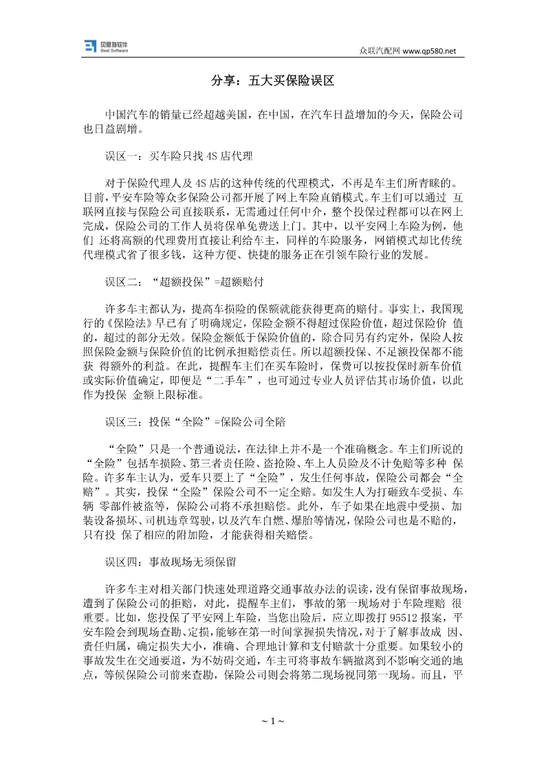 众联汽配网www.qp580.net分享:五大买保险误区中国汽车的销量已经超越美国,在中国,在汽车日益增加的今天,保险公司也日益剧增。误区一:买车险只找4S店代理对于保险代理人及4S店的这种传统的代理模式,不再是车主们所青睐的。目前,平安车险等众多保险公司都开展了网上车险直销模式。车主们可以通过互联网直接与保险公司直接联系,无需通过任何中介,整个投保过程都可以在网上完成,保险公司的工作人员将保单免费送上门。其中,以平安网上车险为例,他们还将高额的代理费用直接让利给车主,同样的车险服务,网销模式却比传统代理