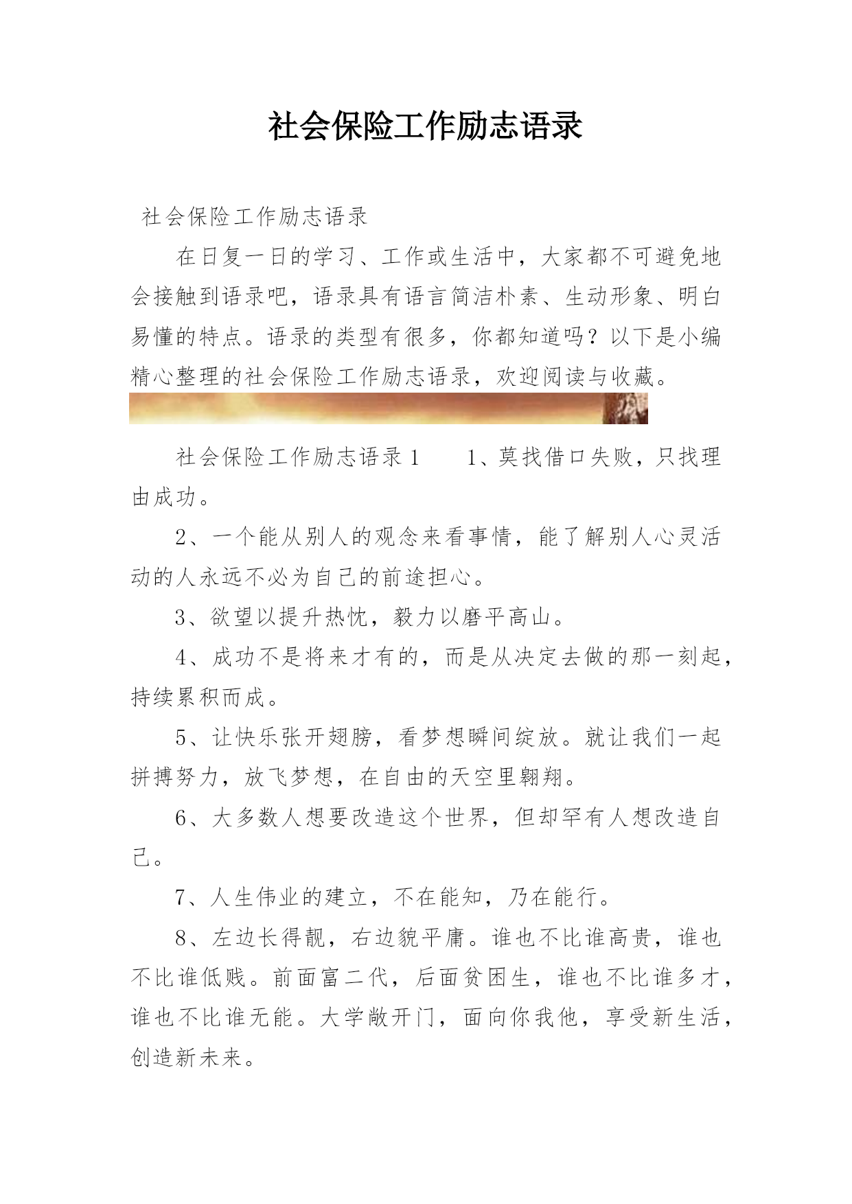 社会保险工作励志语录社会保险工作励志语录在日复一日的学习、工作或生活中,大家都不可避免地会接触到语录吧,语录具有语言简洁朴素、生动形象、明白易懂的特点。语录的类型有很多,你都知道吗?以下是小编精心整理的社会保险工作励志语录,欢迎阅读与收藏。社会保险工作励志语录11、莫找借口失败,只找理由成功。2、一个能从别人的观念来看事情,能了解别人心灵活动的人永远不必为自己的前途担心。3、欲望以提升热忱,毅力以磨平高山。4、成功不是将来才有的,而是从决定去做的那一刻起,持续累积而成。5、让快乐张开翅膀,看梦想瞬间绽放。
