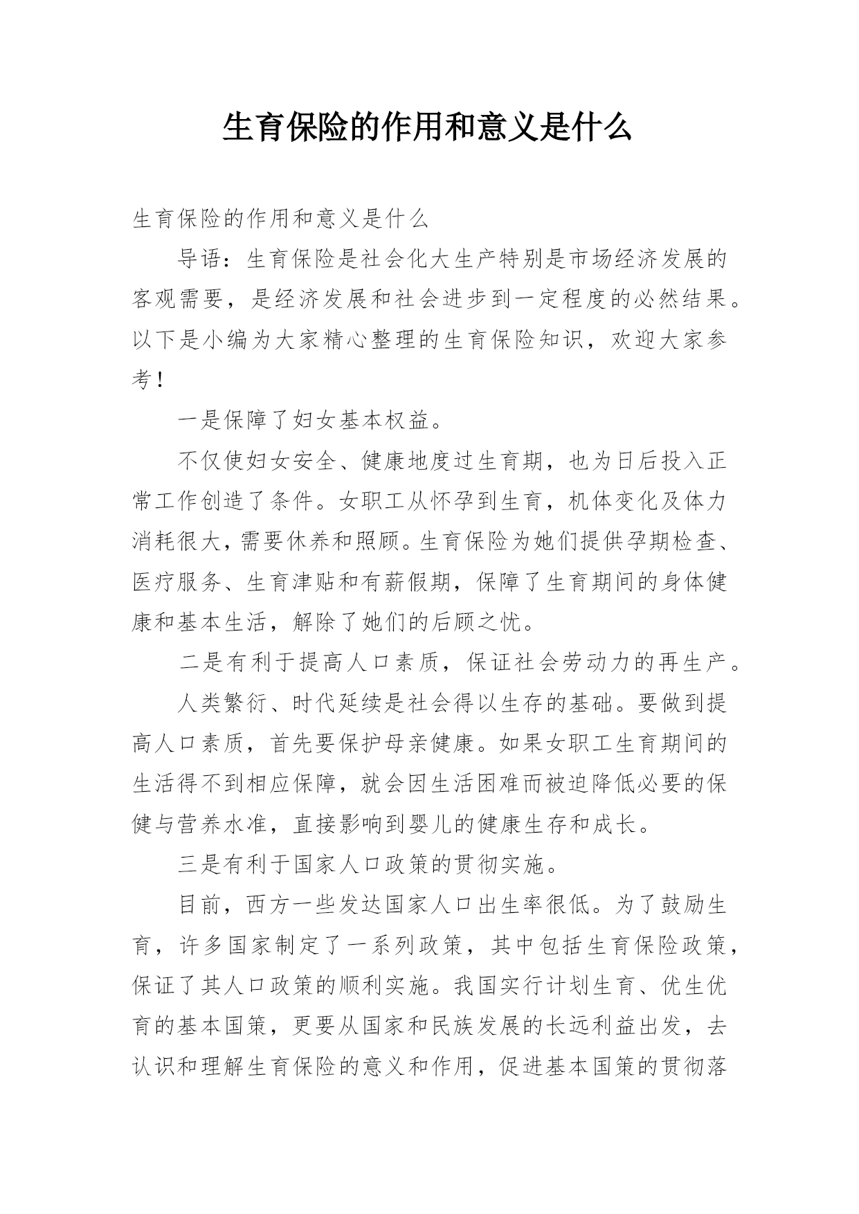 生育保险的作用和意义是什么生育保险的作用和意义是什么导语:生育保险是社会化大生产特别是市场经济发展的客观需要,是经济发展和社会进步到一定程度的必然结果。以下是小编为大家精心整理的生育保险知识,欢迎大家参考!一是保障了妇女基本权益。不仅使妇女安全、健康地度过生育期,也为日后投入正常工作创造了条件。女职工从怀孕到生育,机体变化及体力消耗很大,需要休养和照顾。生育保险为她们提供孕期检查、医疗服务、生育津贴和有薪假期,保障了生育期间的身体健康和基本生活,解除了她们的后顾之忧。二是有利于提高人口素质,保证社会劳动力