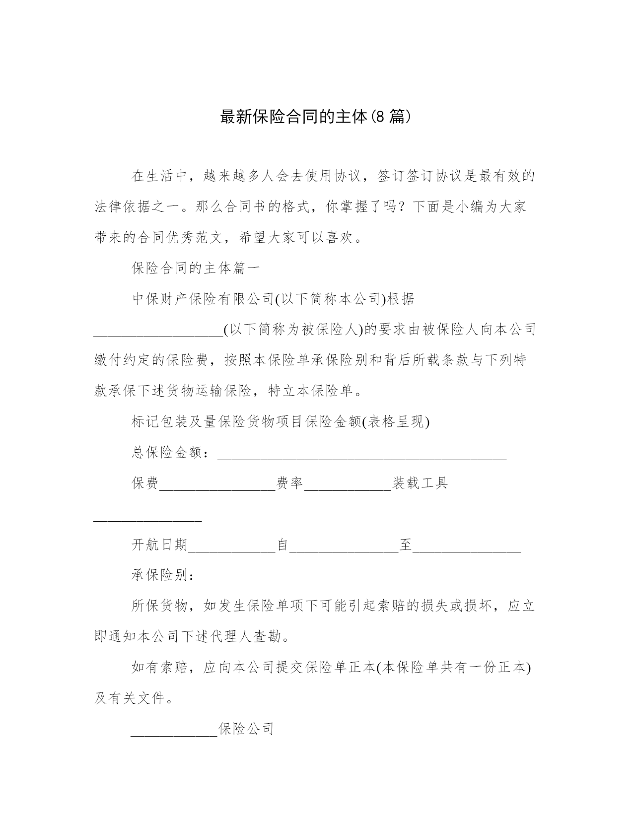 最新保险合同的主体(8篇)在生活中,越来越多人会去使用协议,签订签订协议是最有效的法律依据之一。那么合同书的格式,你掌握了吗?下面是小编为大家带来的合同优秀范文,希望大家可以喜欢。保险合同的主体篇一中保财产保险有限公司(以下简称本公司)根据__________________(以下简称为被保险人)的要求由被保险人向本公司缴付约定的保险费,按照本保险单承保险别和背后所载条款与下列特款承保下述货物运输保险,特立本保险单。标记包装及量保险货物项目保险金额(表格呈现)总保险金额:_________________