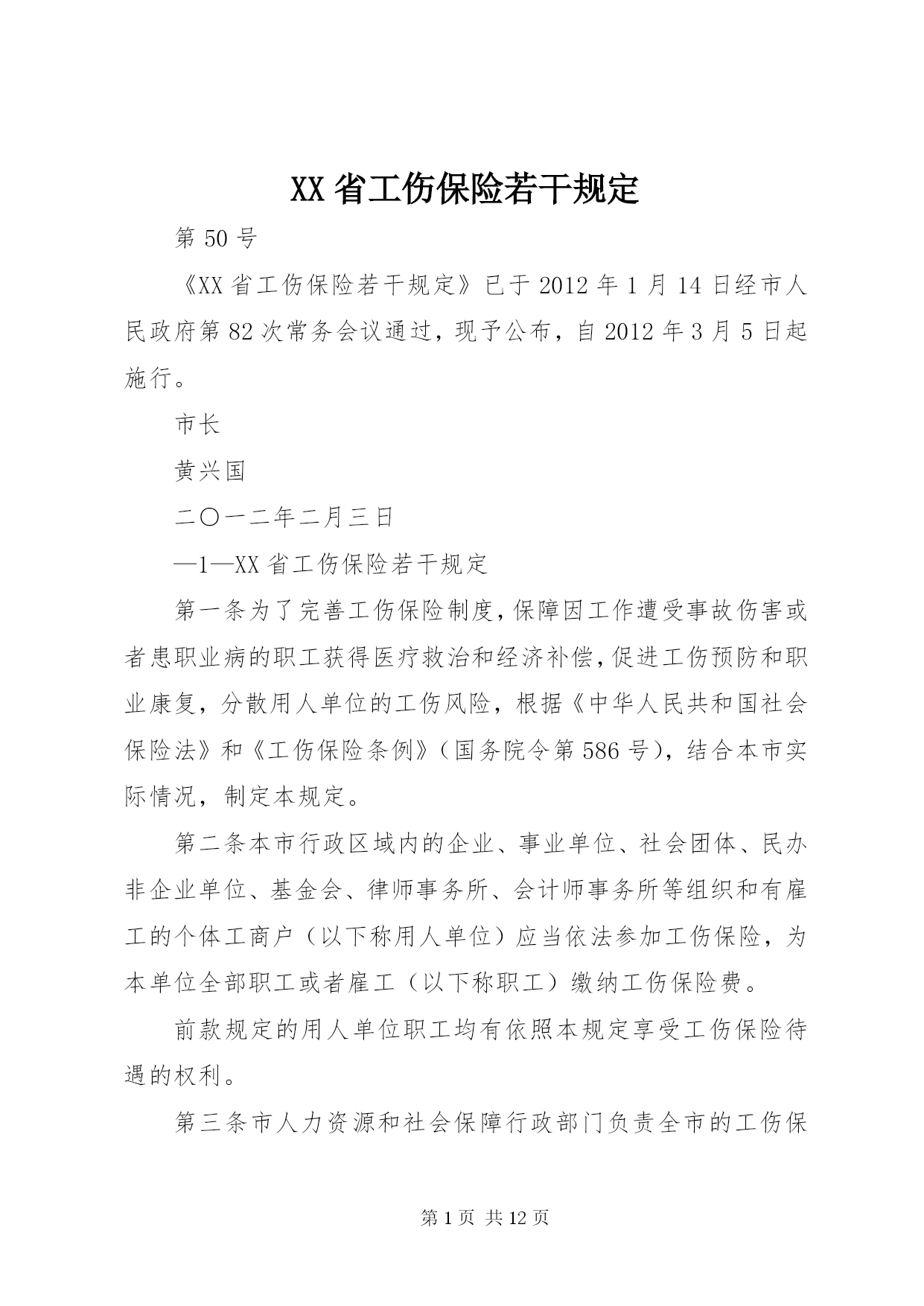 第PAGE\*Arabic\*MERGEFORMAT12页共NUMPAGES\*MERGEFORMAT12页XX省工伤保险若干规定第50号《XX省工伤保险若干规定》已于2012年1月14日经市人民政府第82次常务会议通过,现予公布,自2012年3月5日起施行。市长黄兴国二○一二年二月三日—1—XX省工伤保险若干规定第一条为了完善工伤保险制度,保障因工作遭受事故伤害或者患职业病的职工获得医疗救治和经济补偿,促进工伤预防和职业康复,分散用人单位的工伤风险,根据《中华人民共和国社会保险法》和《工伤保
