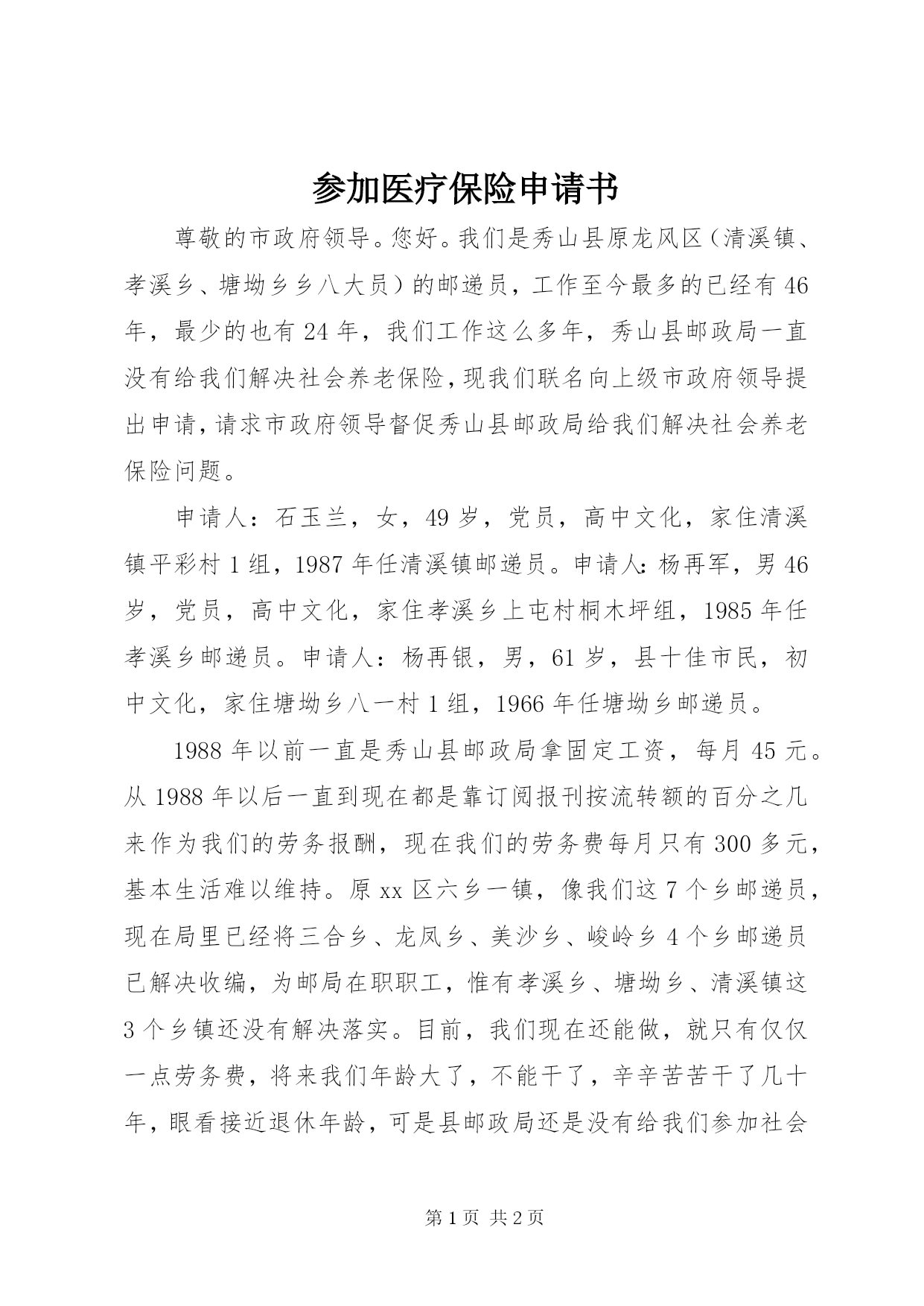 第PAGE\*Arabic\*MERGEFORMAT2页共NUMPAGES\*MERGEFORMAT2页参加医疗保险申请书尊敬的市政府领导。您好。我们是秀山县原龙风区(清溪镇、孝溪乡、塘坳乡乡八大员)的邮递员,工作至今最多的已经有46年,最少的也有24年,我们工作这么多年,秀山县邮政局一直没有给我们解决社会养老保险,现我们联名向上级市政府领导提出申请,请求市政府领导督促秀山县邮政局给我们解决社会养老保险问题。申请人:石玉兰,女,49岁,党员,高中文化,家住清溪镇平彩村1组,1987年任清溪镇邮