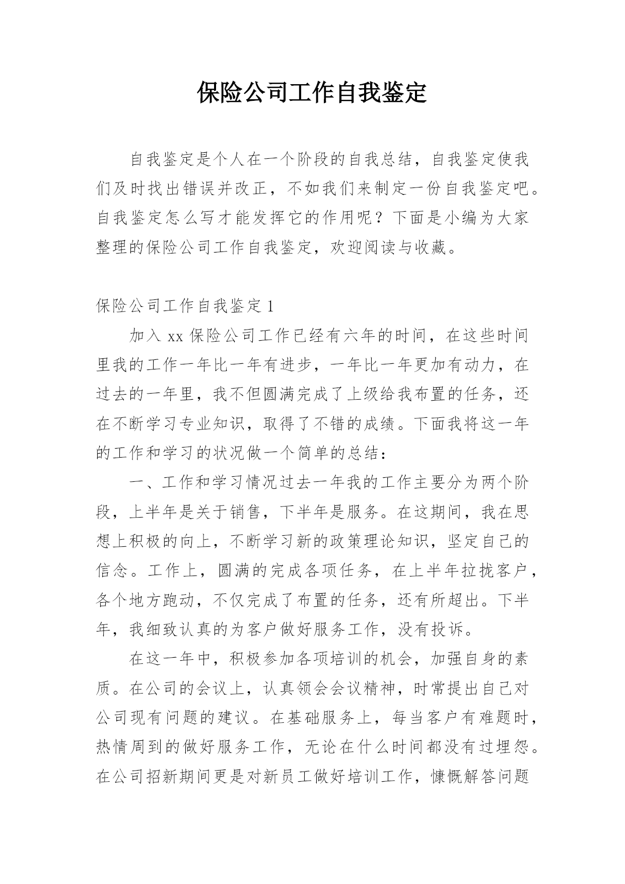 保险公司工作自我鉴定自我鉴定是个人在一个阶段的自我总结,自我鉴定使我们及时找出错误并改正,不如我们来制定一份自我鉴定吧。自我鉴定怎么写才能发挥它的作用呢?下面是小编为大家整理的保险公司工作自我鉴定,欢迎阅读与收藏。保险公司工作自我鉴定1加入xx保险公司工作已经有六年的时间,在这些时间里我的工作一年比一年有进步,一年比一年更加有动力,在过去的一年里,我不但圆满完成了上级给我布置的任务,还在不断学习专业知识,取得了不错的成绩。下面我将这一年的工作和学习的状况做一个简单的总结:一、工作和学习情况过去一年我的工作