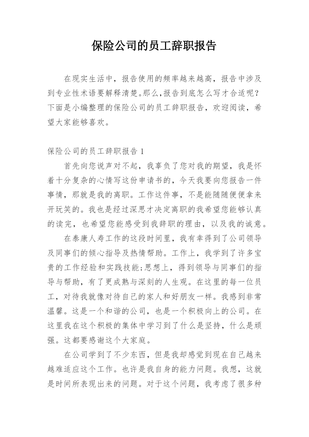 保险公司的员工辞职报告在现实生活中,报告使用的频率越来越高,报告中涉及到专业性术语要解释清楚。那么,报告到底怎么写才合适呢?下面是小编整理的保险公司的员工辞职报告,欢迎阅读,希望大家能够喜欢。保险公司的员工辞职报告1首先向您说声对不起,我辜负了您对我的期望,我是怀着十分复杂的心情写这份申请书的,今天我要向您报告一件事情,那就是我的离职。工作这件事,不是能随随便便拿来开玩笑的。我也是经过深思才决定离职的我希望您能够认真的读完,也希望您能感受到我辞职的理由,以及我的诚意。在泰康人寿工作的这段时间里,我有幸得到