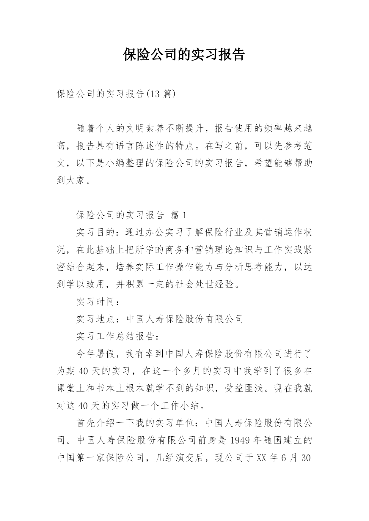 保险公司的实习报告保险公司的实习报告(13篇)随着个人的文明素养不断提升,报告使用的频率越来越高,报告具有语言陈述性的特点。在写之前,可以先参考范文,以下是小编整理的保险公司的实习报告,希望能够帮助到大家。保险公司的实习报告篇1实习目的:通过办公实习了解保险行业及其营销运作状况,在此基础上把所学的商务和营销理论知识与工作实践紧密结合起来,培养实际工作操作能力与分析思考能力,以达到学以致用,并积累一定的社会处世经验。实习时间:实习地点:中国人寿保险股份有限公司实习工作总结报告:今年暑假,我有幸到中国人寿保险