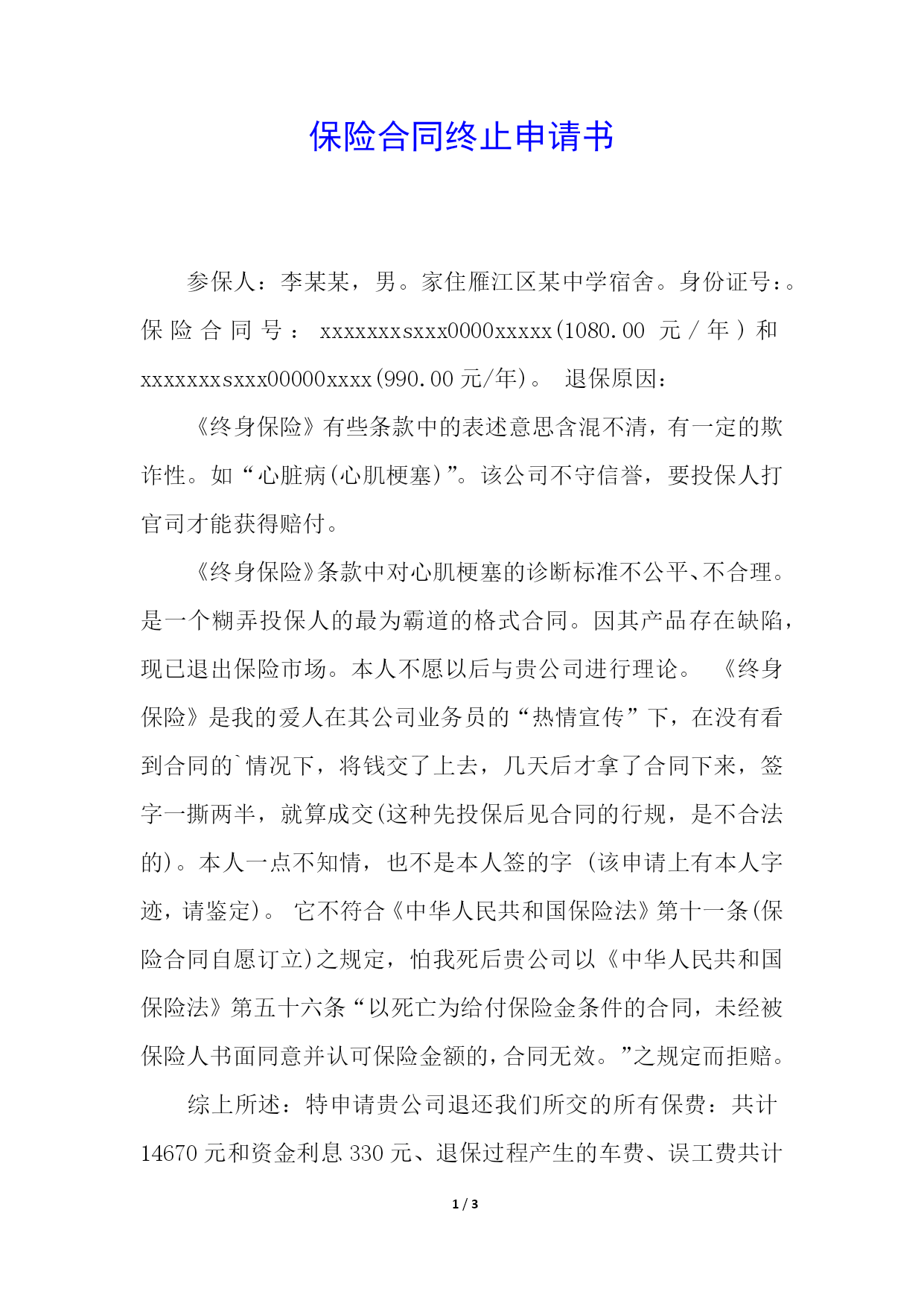 PAGE3/NUMPAGES3保险合同终止申请书参保人:李某某,男。家住雁江区某中学宿舍。身份证号:。保险合同号:xxxxxxxsxxx0000xxxxx(1080.00元/年)和xxxxxxxsxxx00000xxxx(990.00元/年)。退保原因:《终身保险》有些条款中的表述意思含混不清,有一定的欺诈性。如“心脏病(心肌梗塞)”。该公司不守信誉,要投保人打官司才能获得赔付。《终身保险》条款中对心肌梗塞的诊断标准不公平、不合理。是一个糊弄投保人的最为霸道的格式合同。因其产品存在缺陷,现已退
