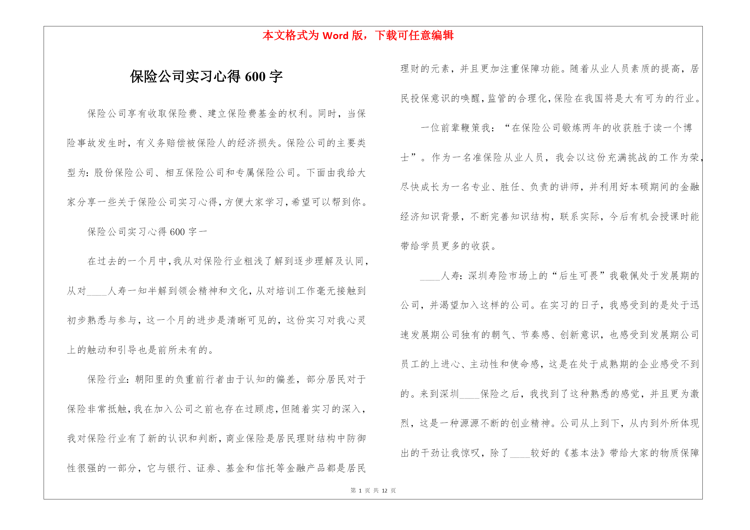 本文格式为Word版,下载可任意编辑第PAGE\*MERGEFORMAT12页共NUMPAGES\*MERGEFORMAT12页保险公司实习心得600字保险公司享有收取保险费、建立保险费基金的权利。同时,当保险事故发生时,有义务赔偿被保险人的经济损失。保险公司的主要类型为:股份保险公司、相互保险公司和专属保险公司。下面由我给大家分享一些关于保险公司实习心得,方便大家学习,希望可以帮到你。保险公司实习心得600字一在过去的一个月中,我从对保险行业粗浅了解到逐步理解及认同,从对____人寿一知半解