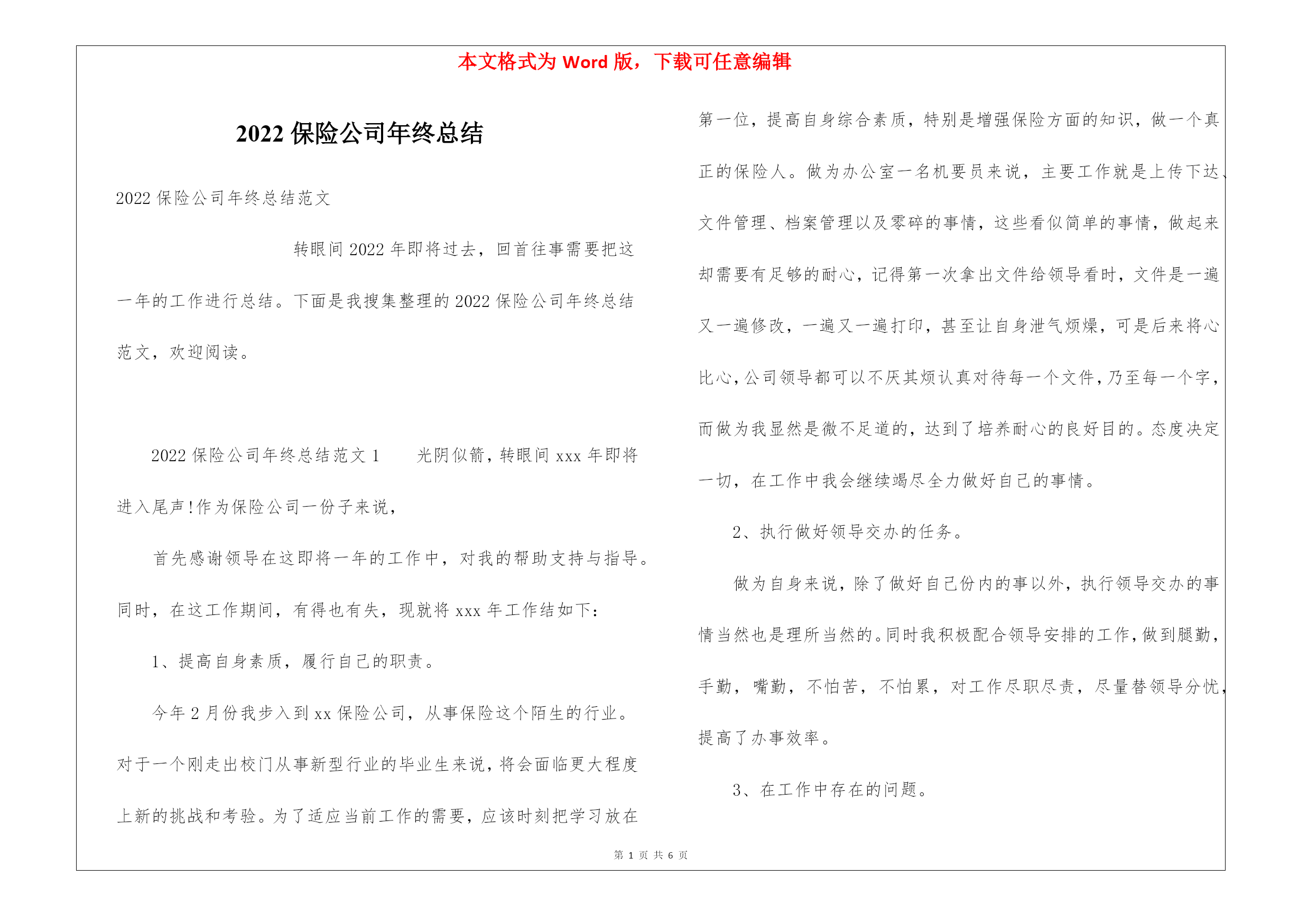本文格式为Word版,下载可任意编辑第PAGE\*MERGEFORMAT6页共NUMPAGES\*MERGEFORMAT6页2022保险公司年终总结2022保险公司年终总结范文转眼间2022年即将过去,回首往事需要把这一年的工作进行总结。下面是我搜集整理的2022保险公司年终总结范文,欢迎阅读。2022保险公司年终总结范文1光阴似箭,转眼间xxx年即将进入尾声!作为保险公司一份子来说,首先感谢领导在这即将一年的工作中,对我的帮助支持与指导。同时,在这工作期间,有得也有失,现就将xxx年工作结如