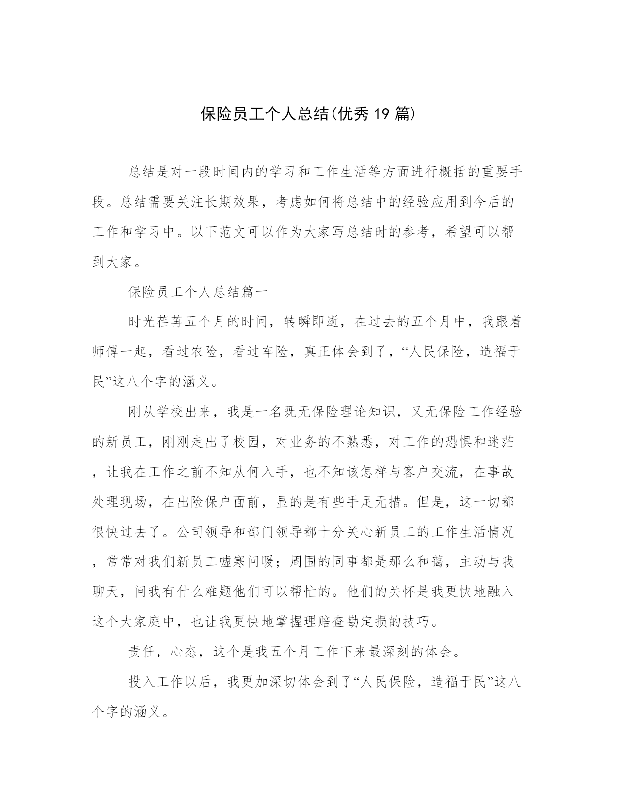 保险员工个人总结(优秀19篇)总结是对一段时间内的学习和工作生活等方面进行概括的重要手段。总结需要关注长期效果,考虑如何将总结中的经验应用到今后的工作和学习中。以下范文可以作为大家写总结时的参考,希望可以帮到大家。保险员工个人总结篇一时光荏苒五个月的时间,转瞬即逝,在过去的五个月中,我跟着师傅一起,看过农险,看过车险,真正体会到了,“人民保险,造福于民”这八个字的涵义。刚从学校出来,我是一名既无保险理论知识,又无保险工作经验的新员工,刚刚走出了校园,对业务的不熟悉,对工作的恐惧和迷茫,让我在工作之前不知从