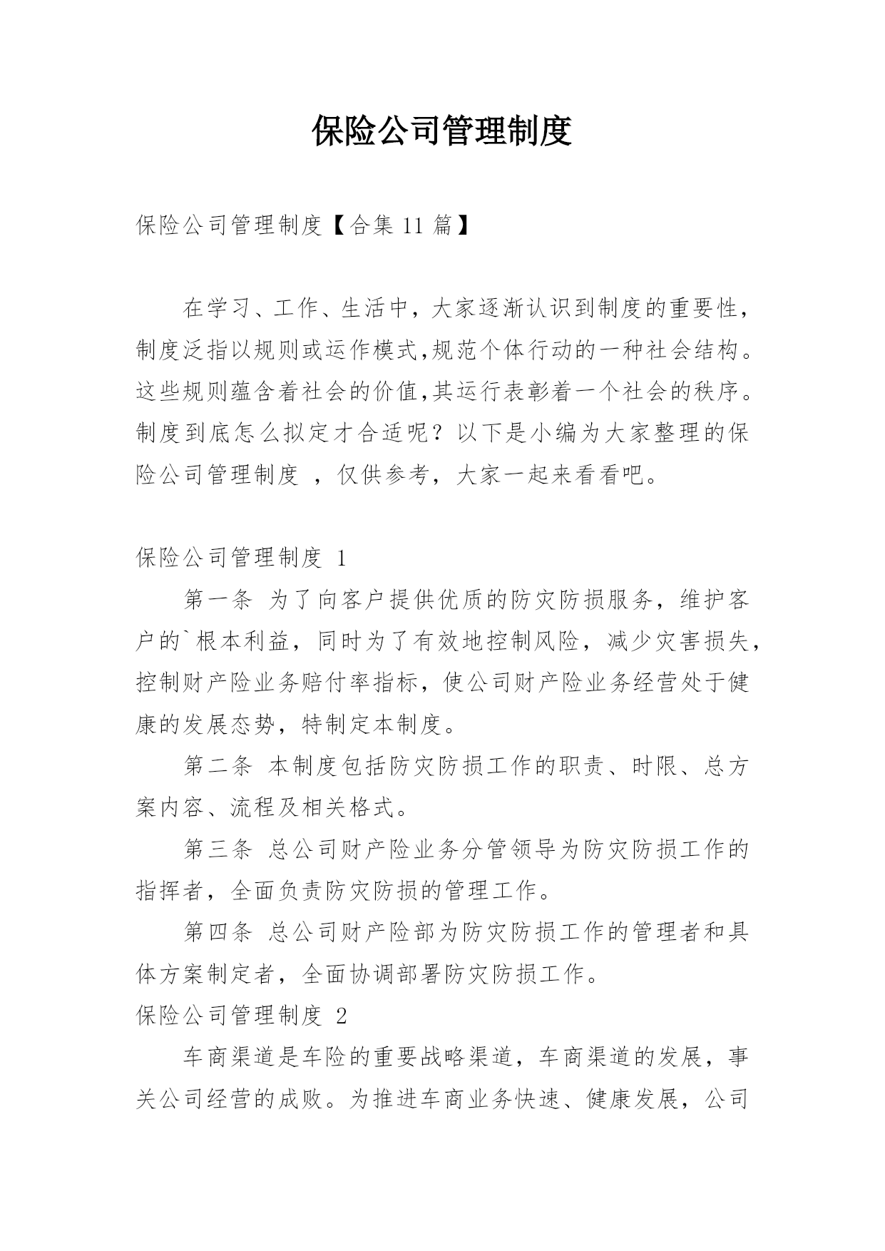 保险公司管理制度保险公司管理制度【合集11篇】在学习、工作、生活中,大家逐渐认识到制度的重要性,制度泛指以规则或运作模式,规范个体行动的一种社会结构。这些规则蕴含着社会的价值,其运行表彰着一个社会的秩序。制度到底怎么拟定才合适呢?以下是小编为大家整理的保险公司管理制度,仅供参考,大家一起来看看吧。保险公司管理制度1第一条为了向客户提供优质的防灾防损服务,维护客户的`根本利益,同时为了有效地控制风险,减少灾害损失,控制财产险业务赔付率指标,使公司财产险业务经营处于健康的发展态势,特制定本制度。第二条本制度包