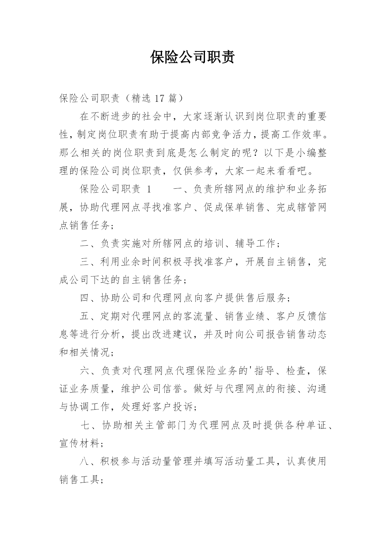 保险公司职责保险公司职责(精选17篇)在不断进步的社会中,大家逐渐认识到岗位职责的重要性,制定岗位职责有助于提高内部竞争活力,提高工作效率。那么相关的岗位职责到底是怎么制定的呢?以下是小编整理的保险公司岗位职责,仅供参考,大家一起来看看吧。保险公司职责1一、负责所辖网点的维护和业务拓展,协助代理网点寻找准客户、促成保单销售、完成辖管网点销售任务;二、负责实施对所辖网点的培训、辅导工作;三、利用业余时间积极寻找准客户,开展自主销售,完成公司下达的自主销售任务;四、协助公司和代理网点向客户提供售后服务;五、定