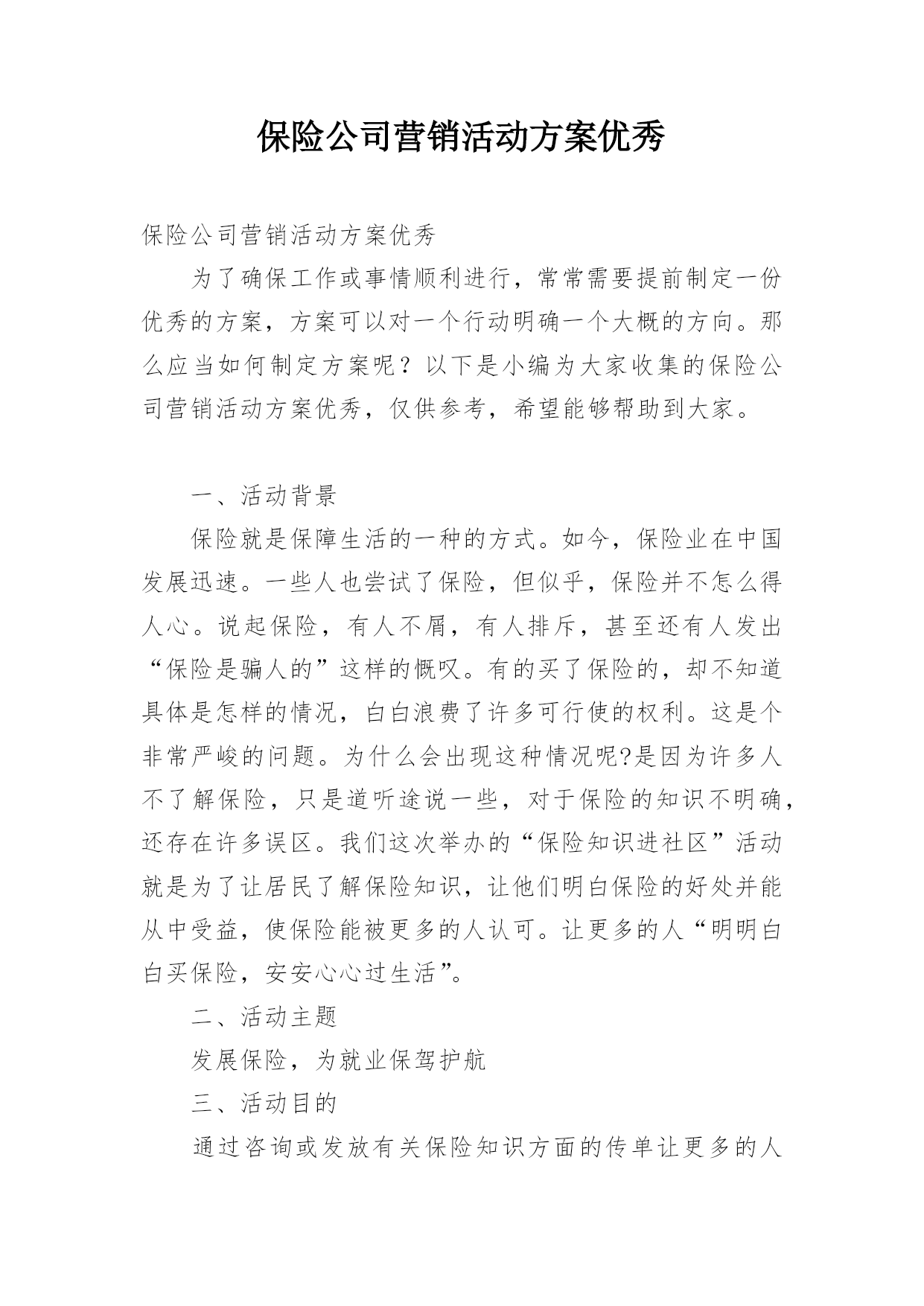 保险公司营销活动方案优秀保险公司营销活动方案优秀为了确保工作或事情顺利进行,常常需要提前制定一份优秀的方案,方案可以对一个行动明确一个大概的方向。那么应当如何制定方案呢?以下是小编为大家收集的保险公司营销活动方案优秀,仅供参考,希望能够帮助到大家。一、活动背景保险就是保障生活的一种的方式。如今,保险业在中国发展迅速。一些人也尝试了保险,但似乎,保险并不怎么得人心。说起保险,有人不屑,有人排斥,甚至还有人发出“保险是骗人的”这样的慨叹。有的买了保险的,却不知道具体是怎样的情况,白白浪费了许多可行使的权利。这