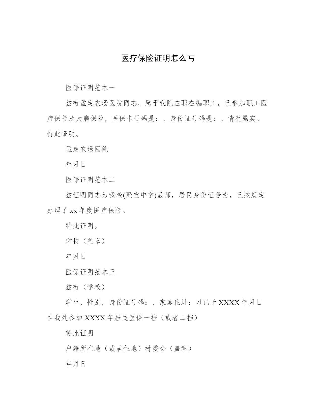 医疗保险证明怎么写医保证明范本一兹有孟定农场医院同志,属于我院在职在编职工,已参加职工医疗保险及大病保险,医保卡号码是:。身份证号码是:。情况属实。特此证明。孟定农场医院年月日医保证明范本二兹证明同志为我校(聚宝中学)教师,居民身份证号为,已按规定办理了xx年度医疗保险。特此证明。学校(盖章)年月日医保证明范本三兹有(学校)学生,性别,身份证号码:,家庭住址:习已于XXXX年月日在我处参加XXXX年居民医保一档(或者二档)特此证明户籍所在地(或居住地)村委会(盖章)年月日医疗保险,(medicalcare