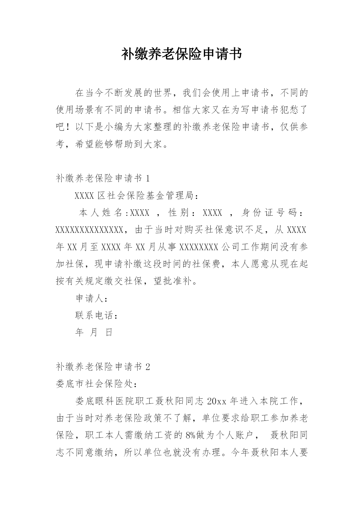 补缴养老保险申请书在当今不断发展的世界,我们会使用上申请书,不同的使用场景有不同的申请书。相信大家又在为写申请书犯愁了吧!以下是小编为大家整理的补缴养老保险申请书,仅供参考,希望能够帮助到大家。补缴养老保险申请书1XXXX区社会保险基金管理局:本人姓名:XXXX,性别:XXXX,身份证号码:XXXXXXXXXXXXXX,由于当时对购买社保意识不足,从XXXX年XX月至XXXX年XX月从事XXXXXXXX公司工作期间没有参加社保,现申请补缴这段时间的社保费,本人愿意从现在起按有关规定缴交社保,望批准补。申请