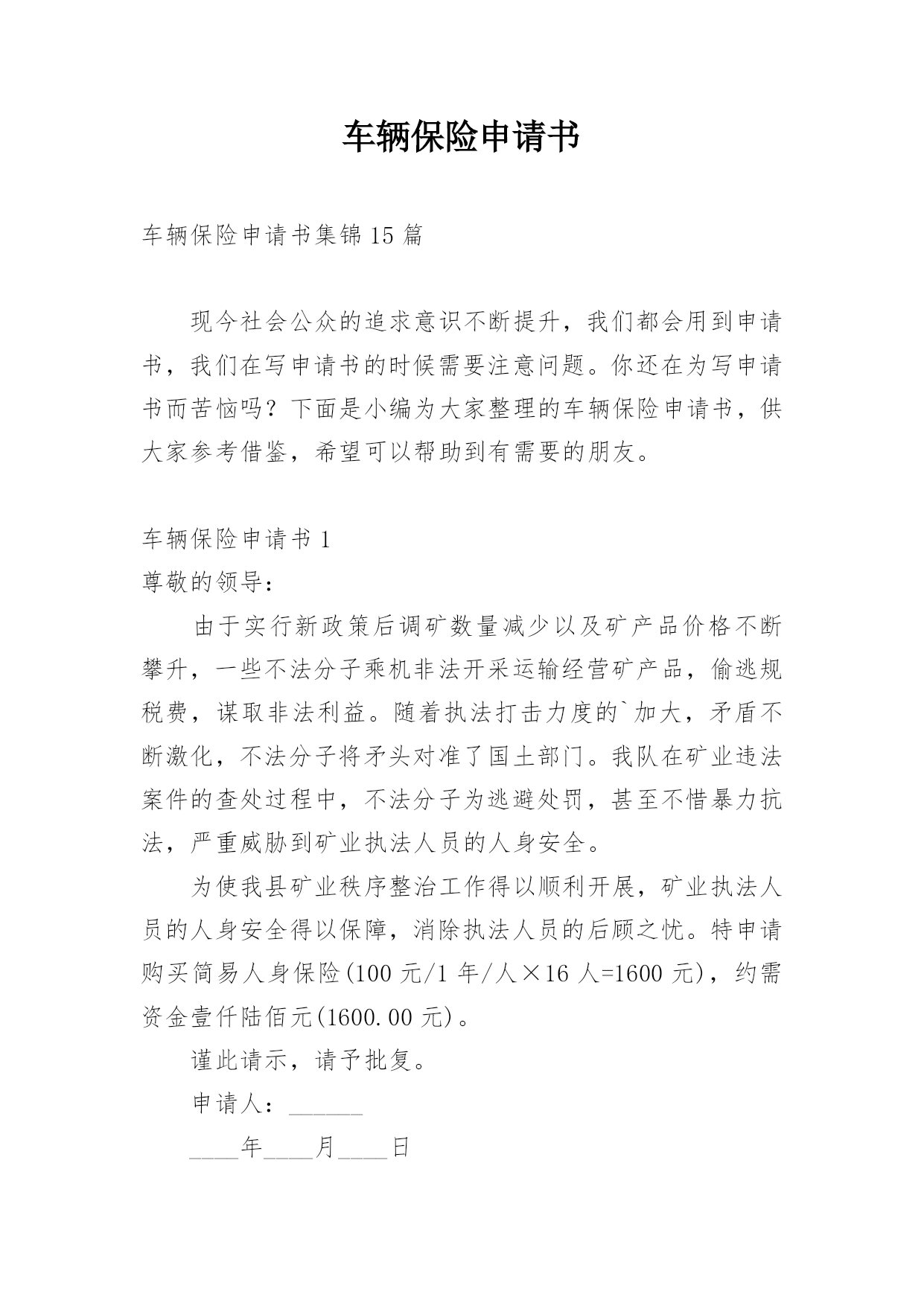 车辆保险申请书车辆保险申请书集锦15篇现今社会公众的追求意识不断提升,我们都会用到申请书,我们在写申请书的时候需要注意问题。你还在为写申请书而苦恼吗?下面是小编为大家整理的车辆保险申请书,供大家参考借鉴,希望可以帮助到有需要的朋友。车辆保险申请书1尊敬的领导:由于实行新政策后调矿数量减少以及矿产品价格不断攀升,一些不法分子乘机非法开采运输经营矿产品,偷逃规税费,谋取非法利益。随着执法打击力度的`加大,矛盾不断激化,不法分子将矛头对准了国土部门。我队在矿业违法案件的查处过程中,不法分子为逃避处罚,甚至不惜暴