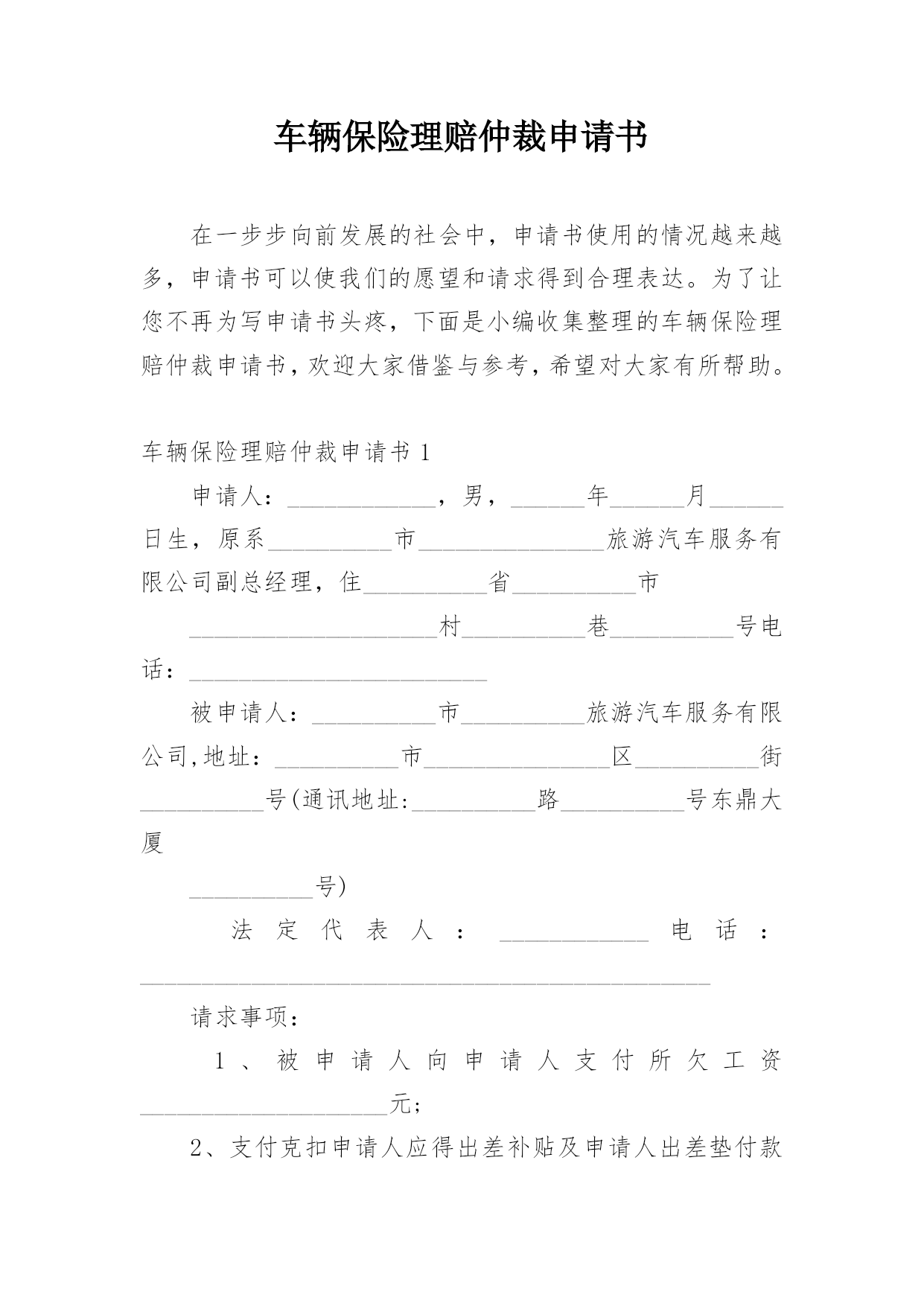 车辆保险理赔仲裁申请书在一步步向前发展的社会中,申请书使用的情况越来越多,申请书可以使我们的愿望和请求得到合理表达。为了让您不再为写申请书头疼,下面是小编收集整理的车辆保险理赔仲裁申请书,欢迎大家借鉴与参考,希望对大家有所帮助。车辆保险理赔仲裁申请书1申请人:____________,男,______年______月______日生,原系__________市_______________旅游汽车服务有限公司副总经理,住__________省__________市____________________村