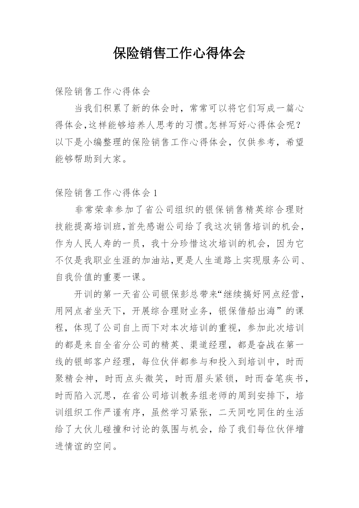 保险销售工作心得体会保险销售工作心得体会当我们积累了新的体会时,常常可以将它们写成一篇心得体会,这样能够培养人思考的习惯。怎样写好心得体会呢?以下是小编整理的保险销售工作心得体会,仅供参考,希望能够帮助到大家。保险销售工作心得体会1非常荣幸参加了省公司组织的银保销售精英综合理财技能提高培训班,首先感谢公司给了我这次销售培训的机会,作为人民人寿的一员,我十分珍惜这次培训的机会,因为它不仅是我职业生涯的加油站,更是人生道路上实现服务公司、自我价值的重要一课。开训的第一天省公司银保彭总带来“继续搞好网点经营,用