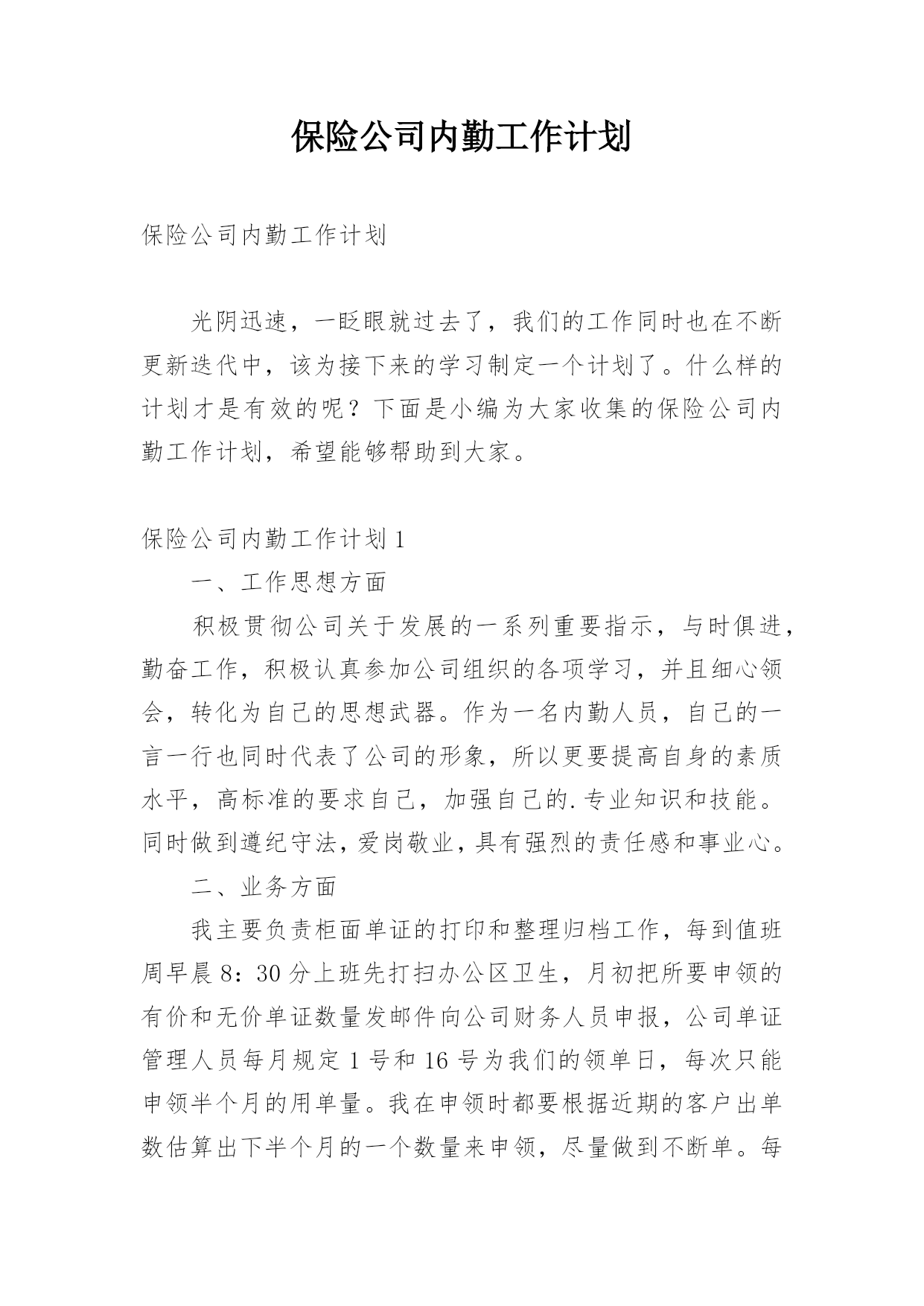 保险公司内勤工作计划保险公司内勤工作计划光阴迅速,一眨眼就过去了,我们的工作同时也在不断更新迭代中,该为接下来的学习制定一个计划了。什么样的计划才是有效的呢?下面是小编为大家收集的保险公司内勤工作计划,希望能够帮助到大家。保险公司内勤工作计划1一、工作思想方面积极贯彻公司关于发展的一系列重要指示,与时俱进,勤奋工作,积极认真参加公司组织的各项学习,并且细心领会,转化为自己的思想武器。作为一名内勤人员,自己的一言一行也同时代表了公司的形象,所以更要提高自身的素质水平,高标准的要求自己,加强自己的.专业知识和