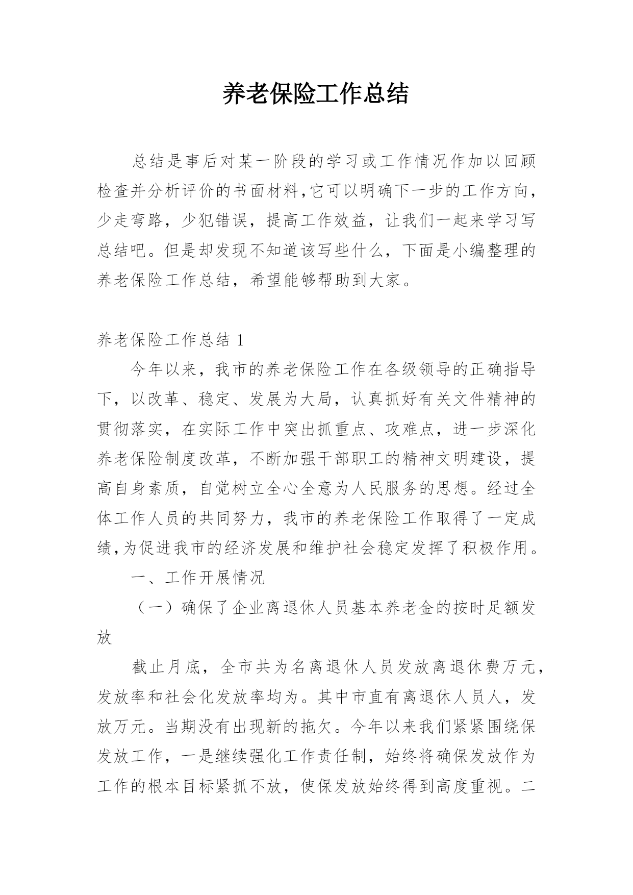 养老保险工作总结总结是事后对某一阶段的学习或工作情况作加以回顾检查并分析评价的书面材料,它可以明确下一步的工作方向,少走弯路,少犯错误,提高工作效益,让我们一起来学习写总结吧。但是却发现不知道该写些什么,下面是小编整理的养老保险工作总结,希望能够帮助到大家。养老保险工作总结1今年以来,我市的养老保险工作在各级领导的正确指导下,以改革、稳定、发展为大局,认真抓好有关文件精神的贯彻落实,在实际工作中突出抓重点、攻难点,进一步深化养老保险制度改革,不断加强干部职工的精神文明建设,提高自身素质,自觉树立全心全意为