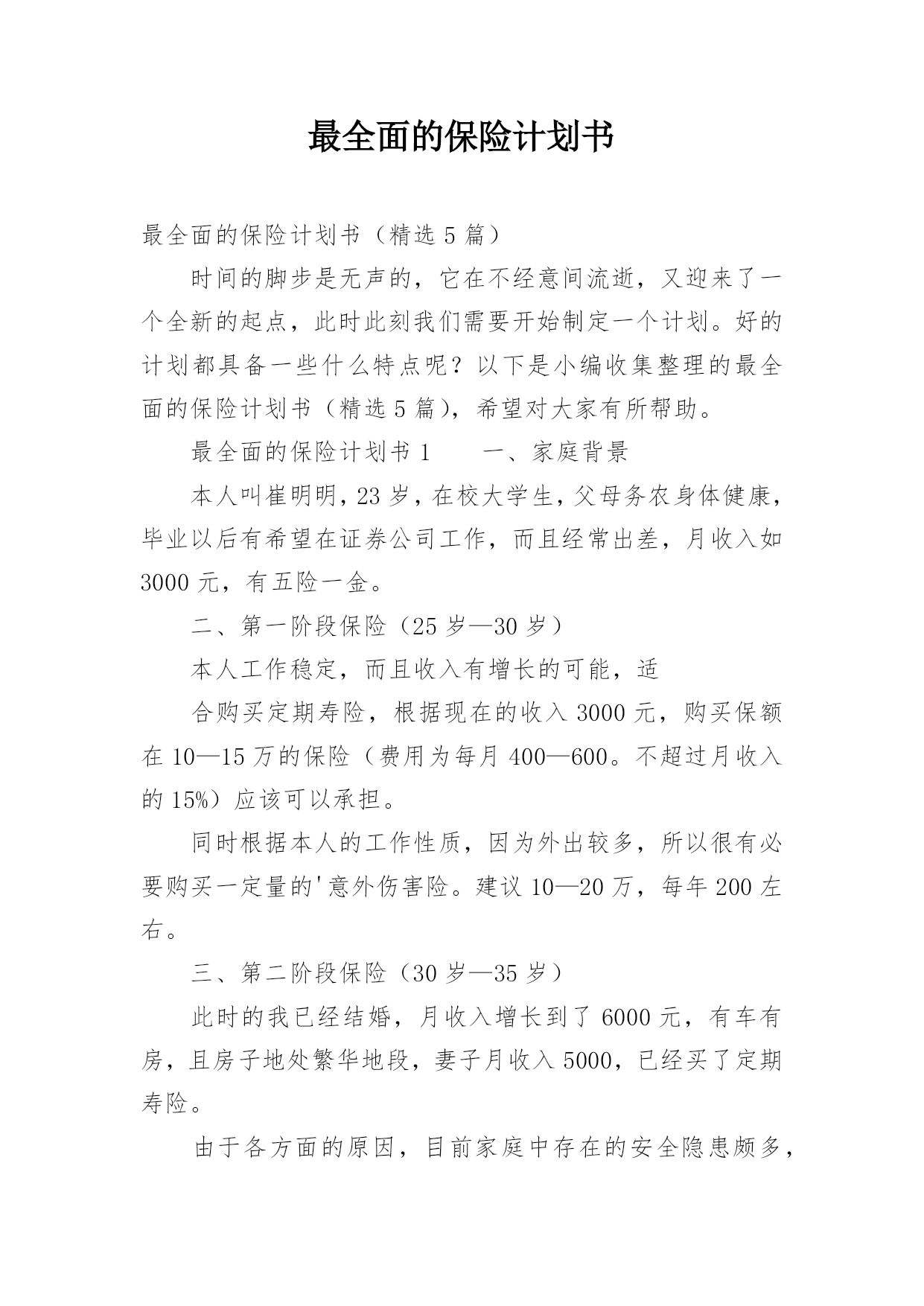 最全面的保险计划书最全面的保险计划书(精选5篇)时间的脚步是无声的,它在不经意间流逝,又迎来了一个全新的起点,此时此刻我们需要开始制定一个计划。好的计划都具备一些什么特点呢?以下是小编收集整理的最全面的保险计划书(精选5篇),希望对大家有所帮助。最全面的保险计划书1一、家庭背景本人叫崔明明,23岁,在校大学生,父母务农身体健康,毕业以后有希望在证券公司工作,而且经常出差,月收入如3000元,有五险一金。二、第一阶段保险(25岁—30岁)本人工作稳定,而且收入有增长的可能,适合购买定期寿险,根据现在的收入3